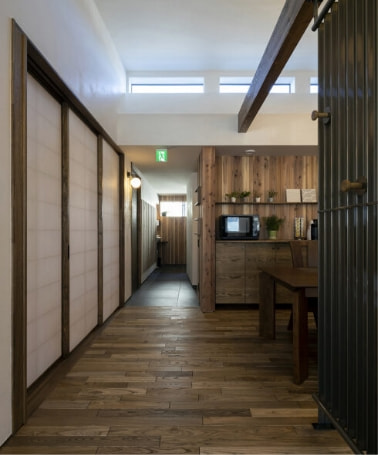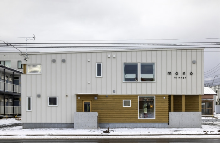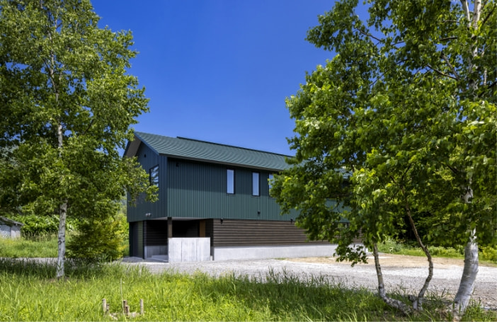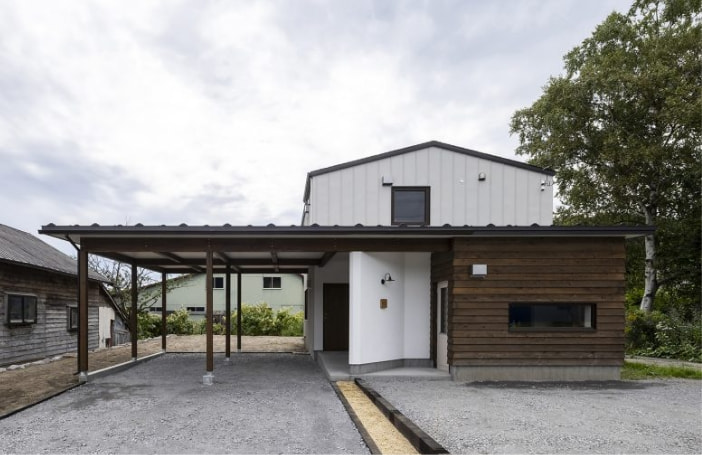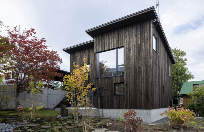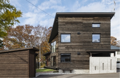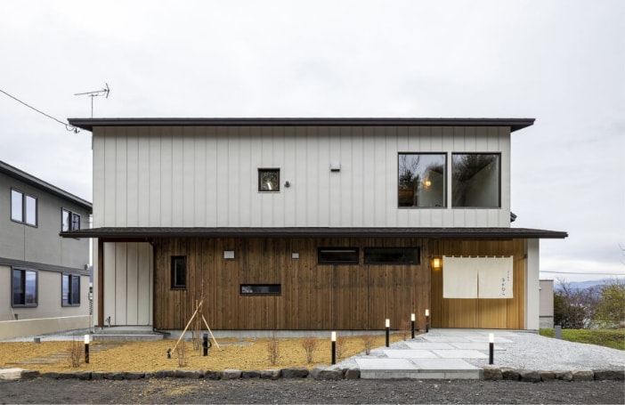 - 道南スギ板張り、モルタル塗り、ガルバリウム鋼板