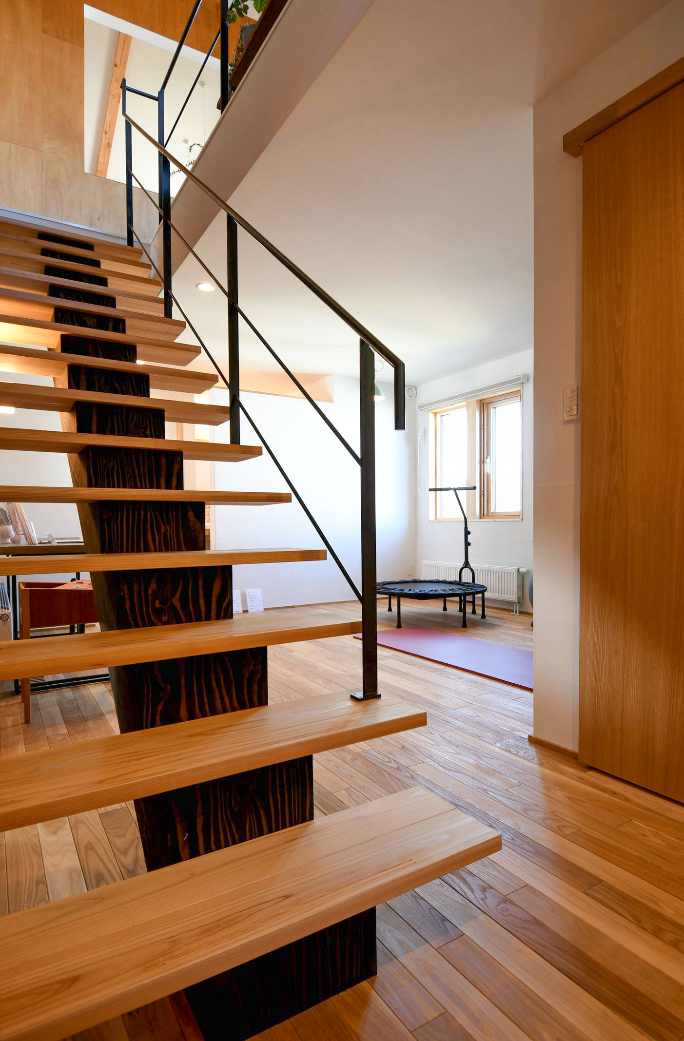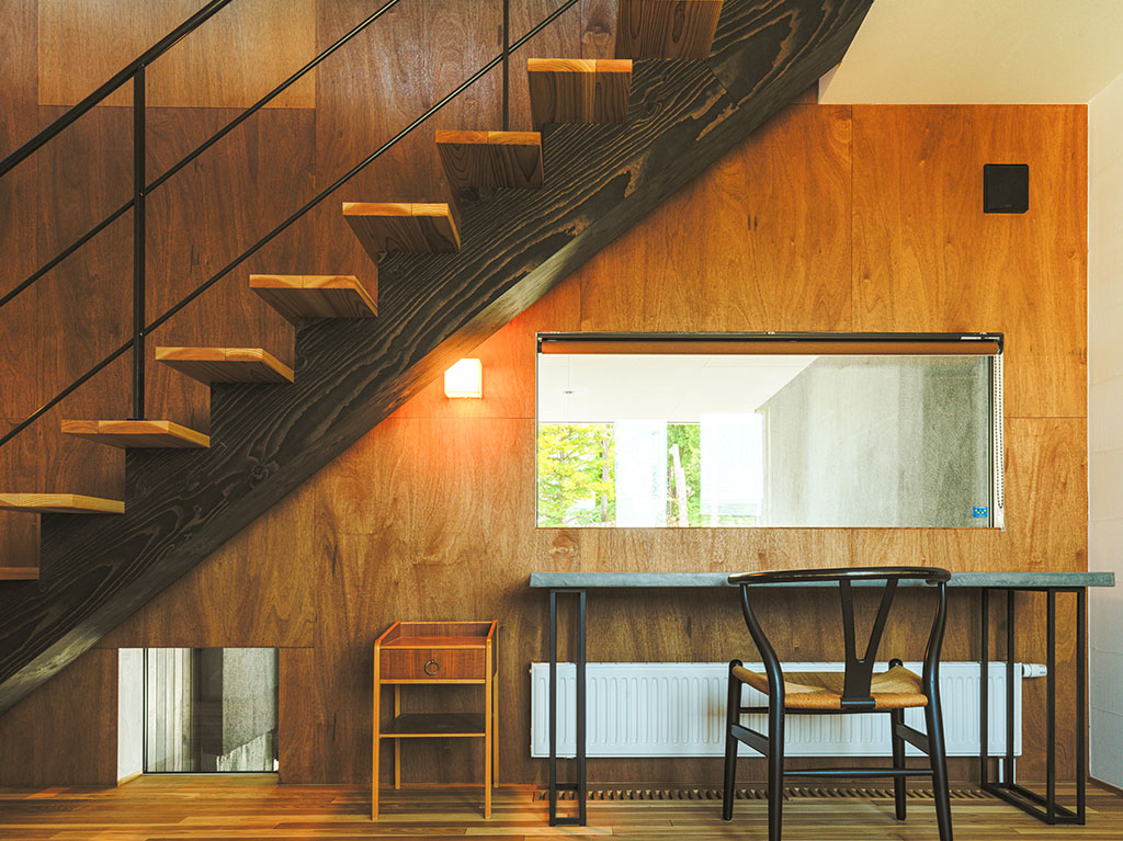 外壁は道産スギの下見板張りで、木の自然なラインを生かした耳付き板。無垢材ならではのラフな印象です。