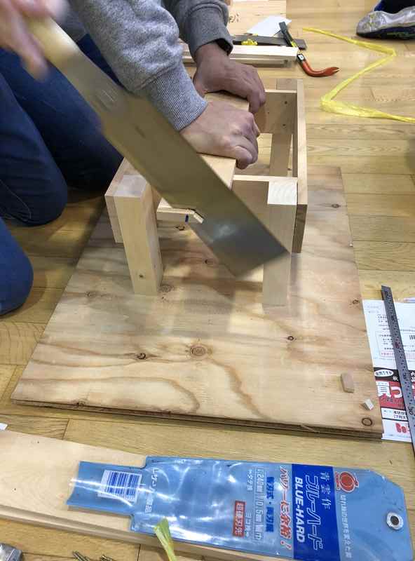 両刃鋸(りょうばのこぎり)で材料を切り揃えます・・・・