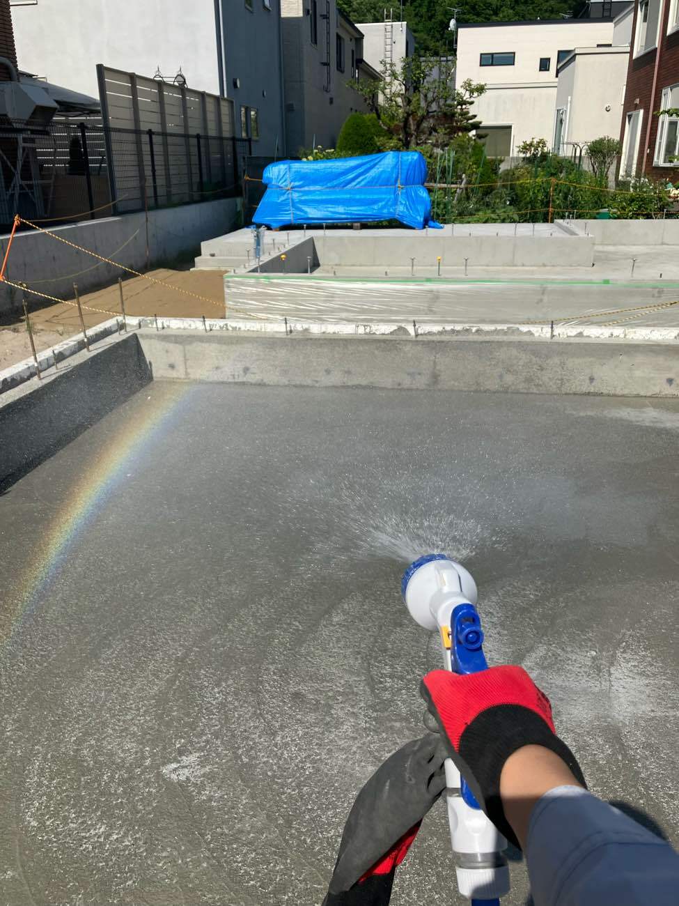 コンクリート打設翌日が30℃を超えていたのでコンクリートに水を撒く現場担当ぶっき~くん。