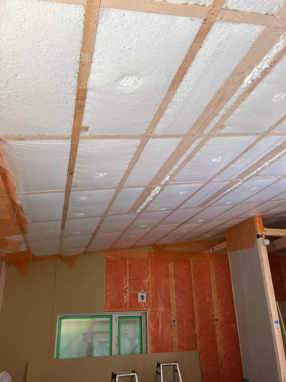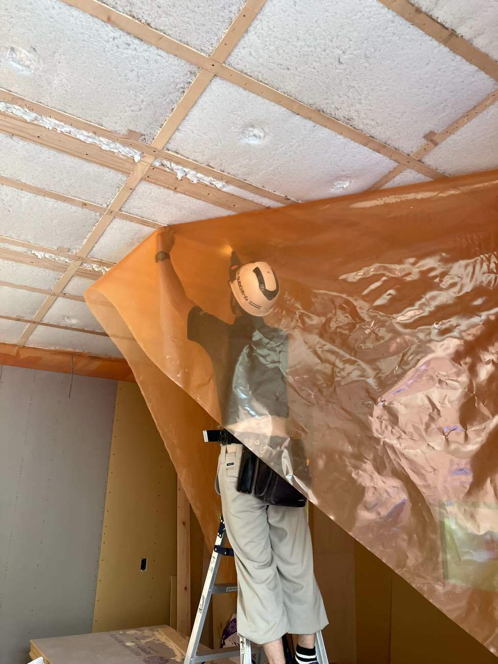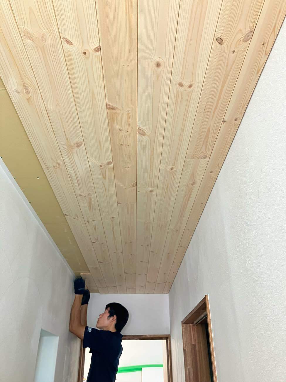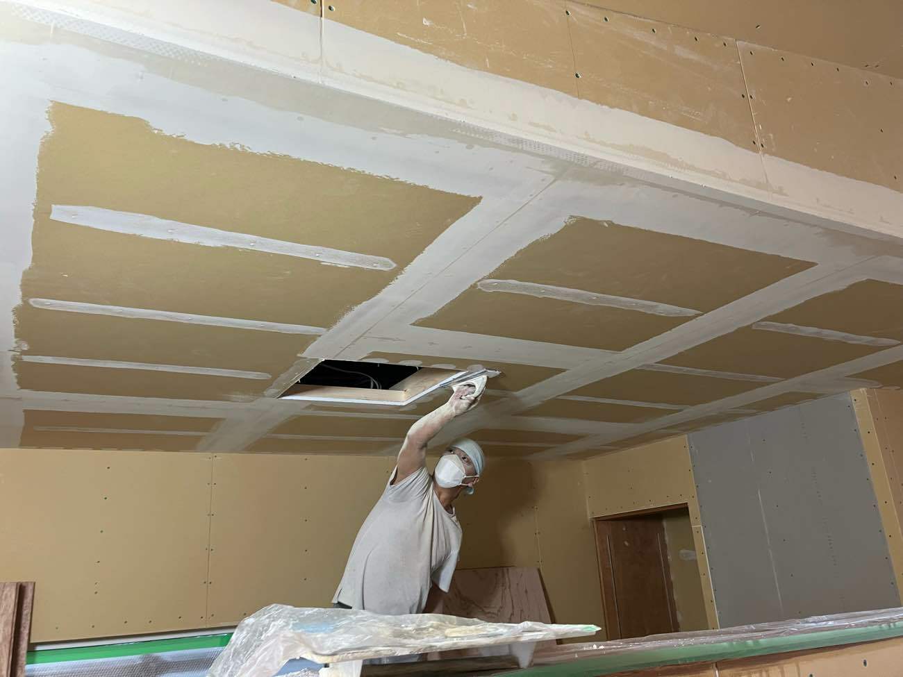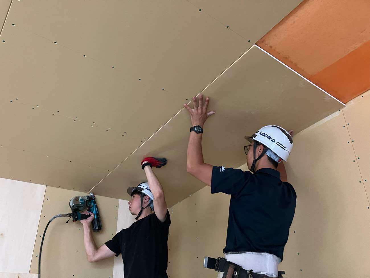 壁の石膏ボードを張り終わり、次は天井の石膏ボードを張っていきます。