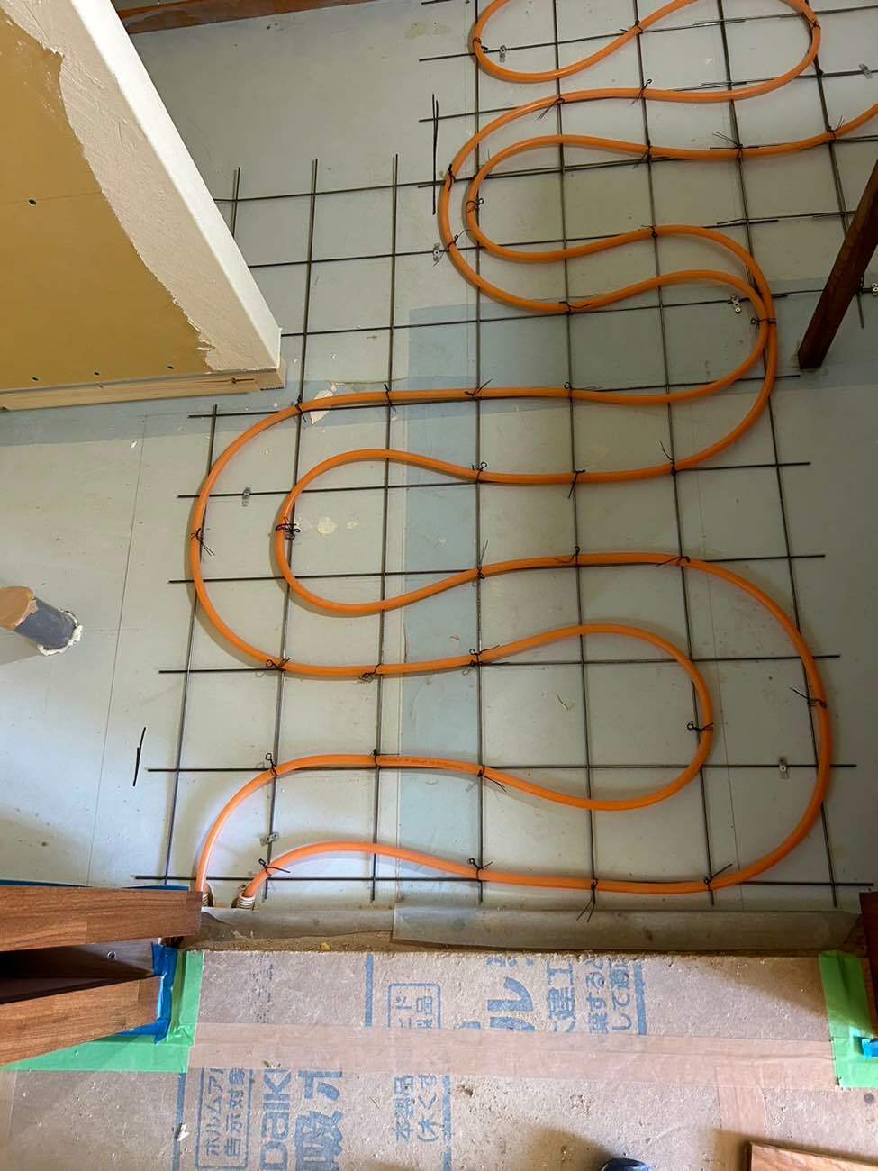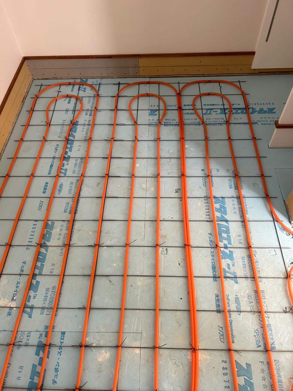 玄関などの土間コンクリートの上に床暖配管を施工するときは、断熱材を敷いた上に暖房配管を施工します。