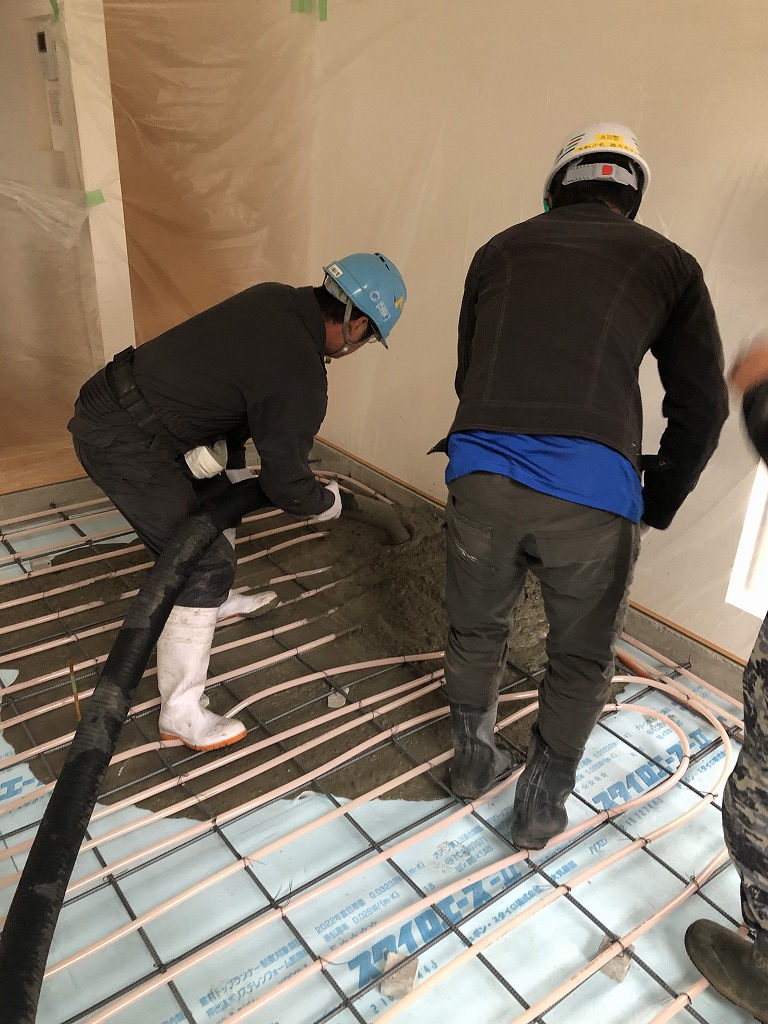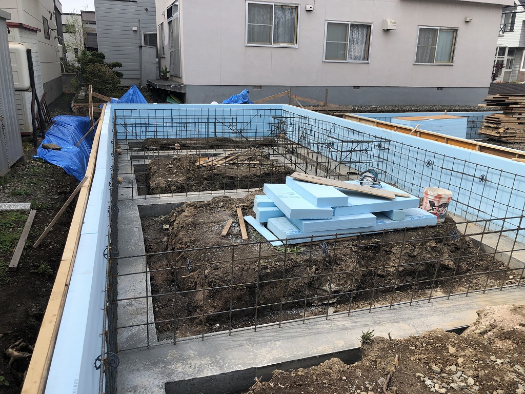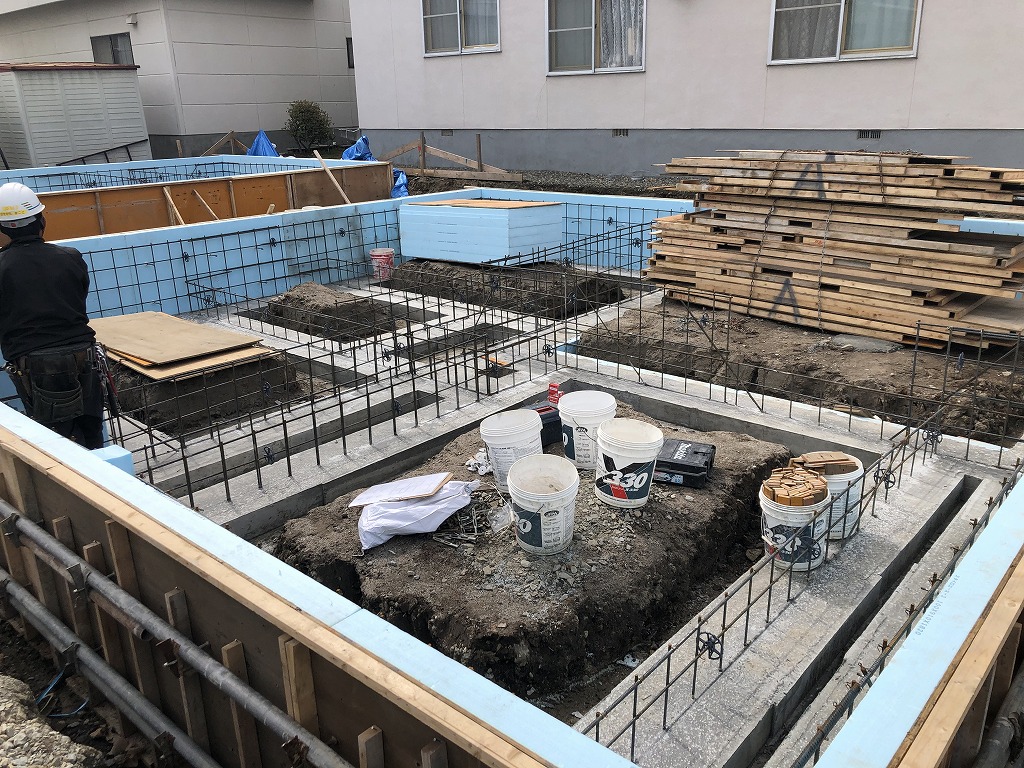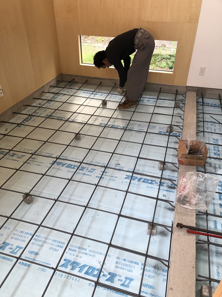 断熱材を敷き詰め鉄筋を組んでいます。このあと床暖房の配管工事をして、