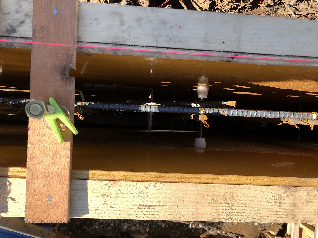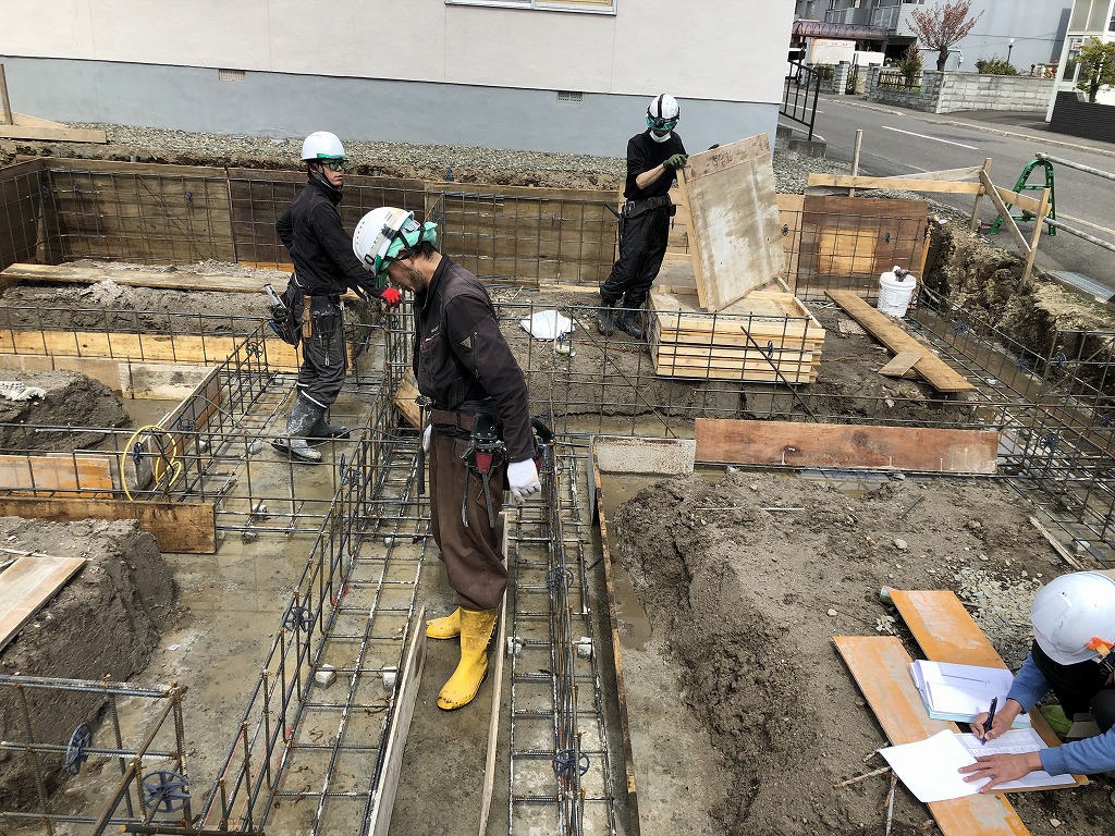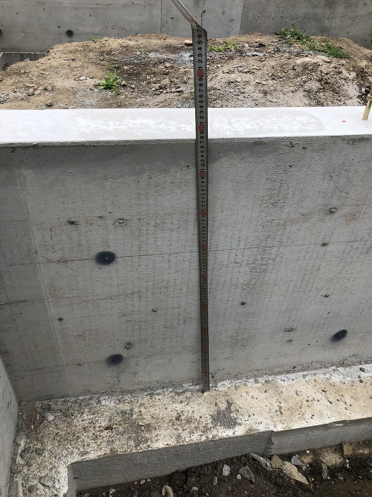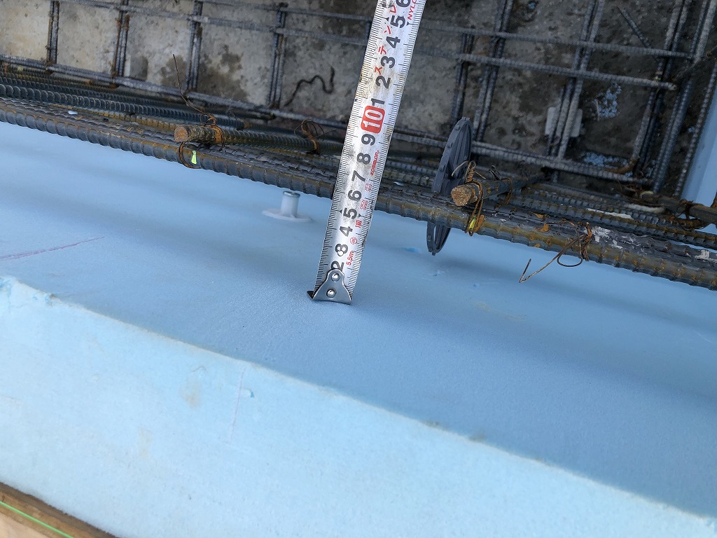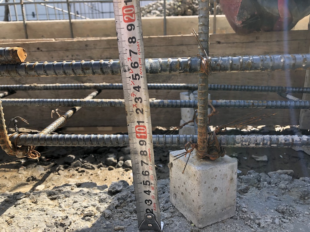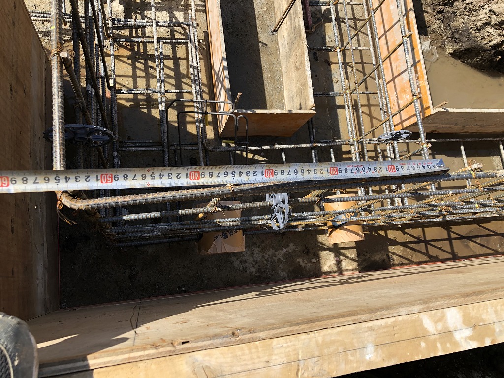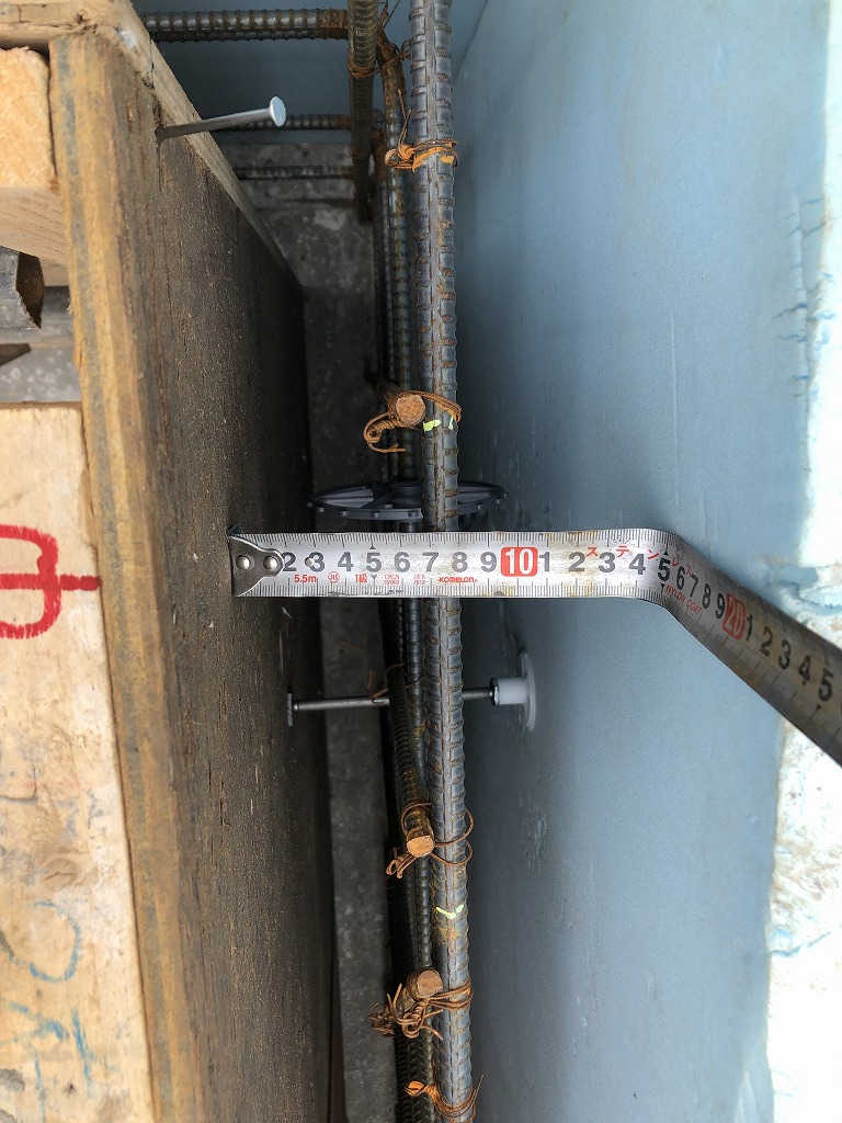 例えば上の写真のように基礎の立ち上がり部分の被り厚さは「4cm以上」お見事です。5cm以上の被り厚さが確保されていますね。これで鉄筋をサビから守ることができます。