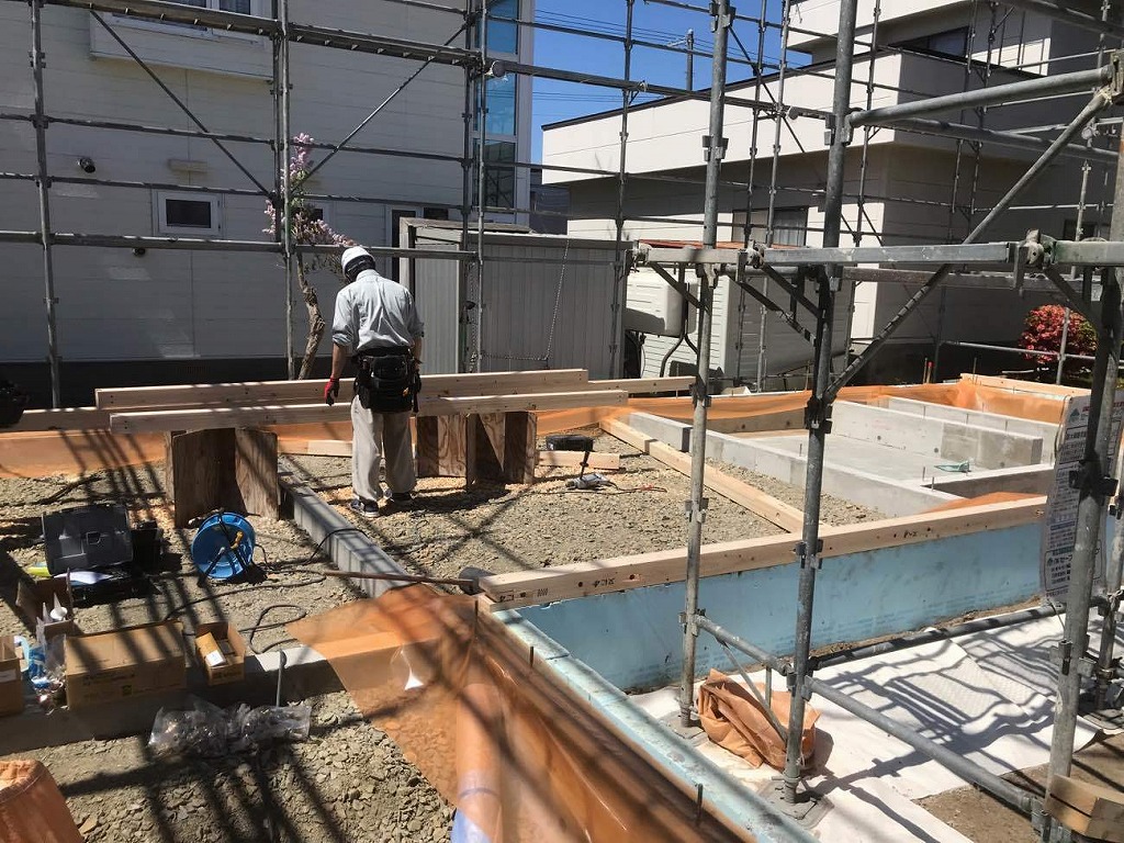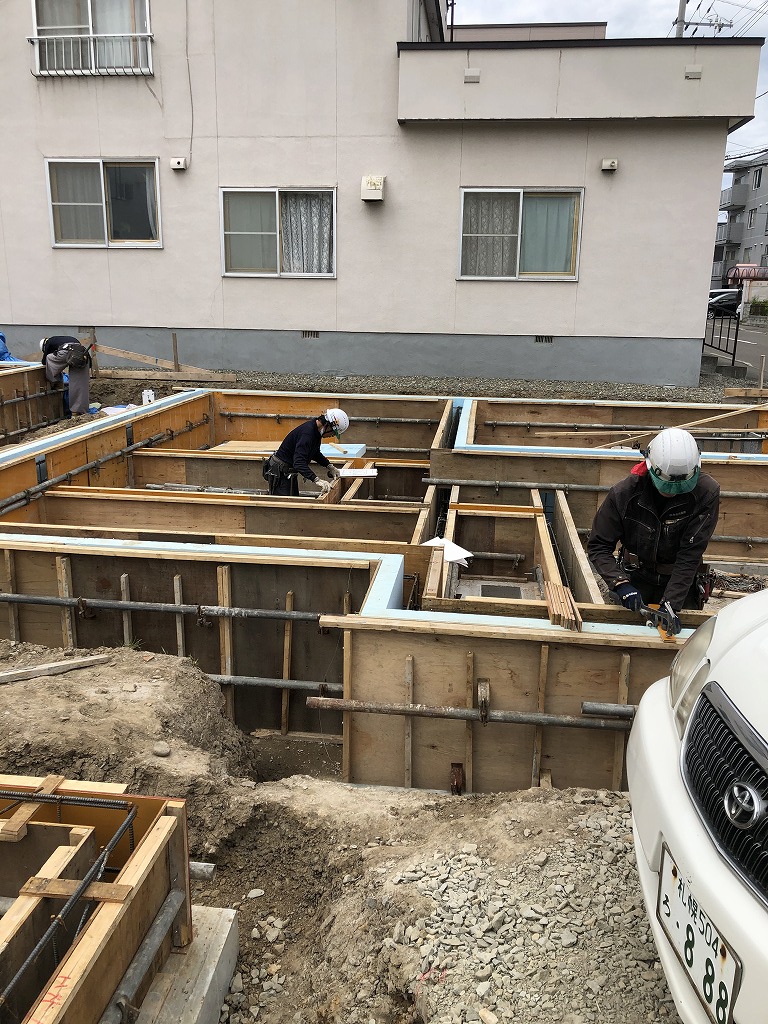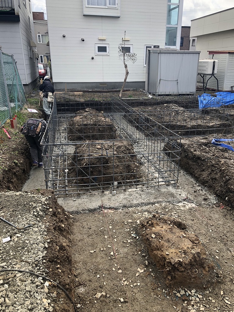 前回で土工事が完了し、作業は鉄筋工事へと流れていきます。