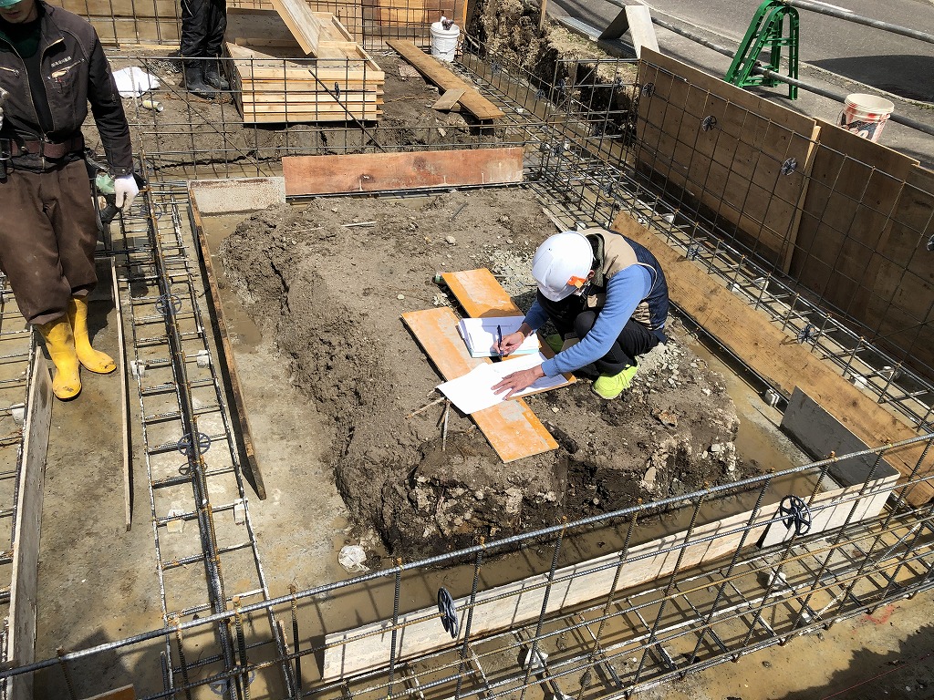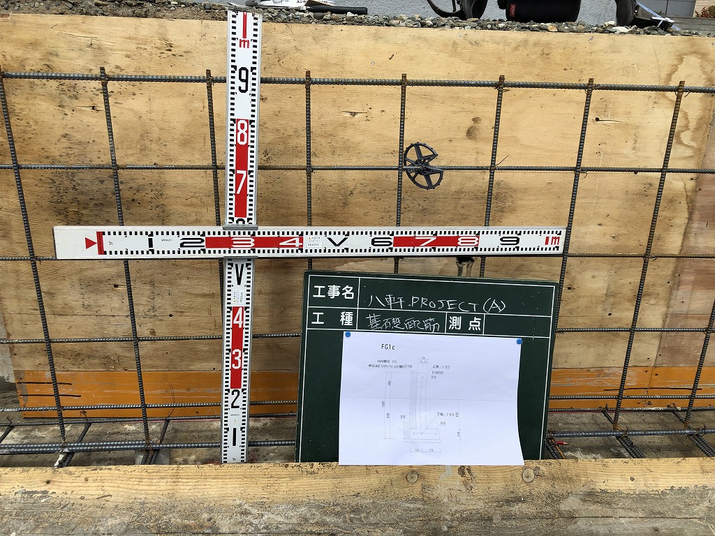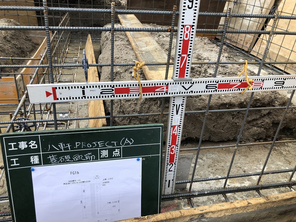 こちらは基礎底盤部分の被り厚さをチェックしているところです。