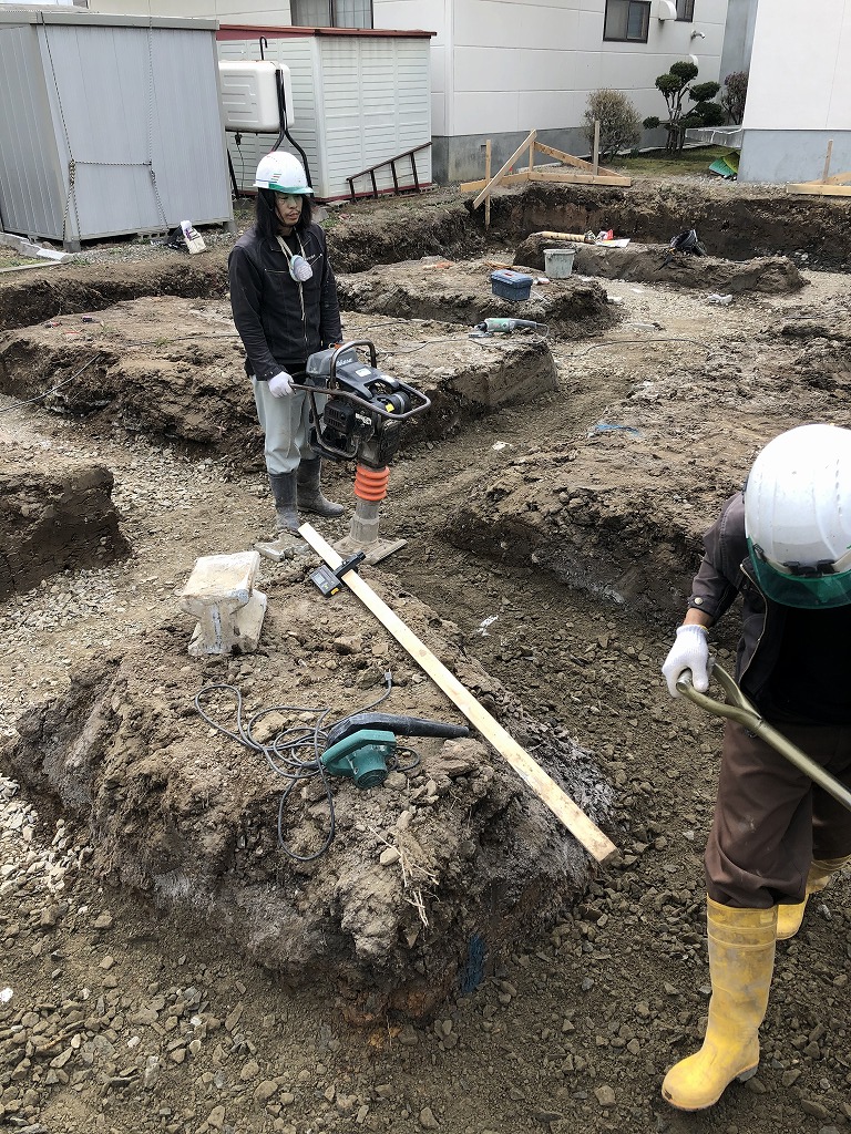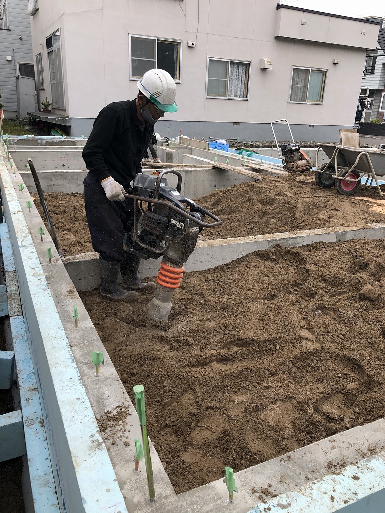 プレートコンパクターで砕石を均した後に、タンピングランマーで締め固めます。