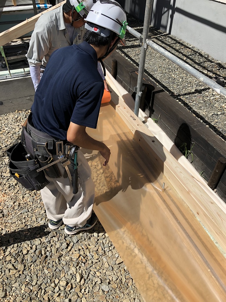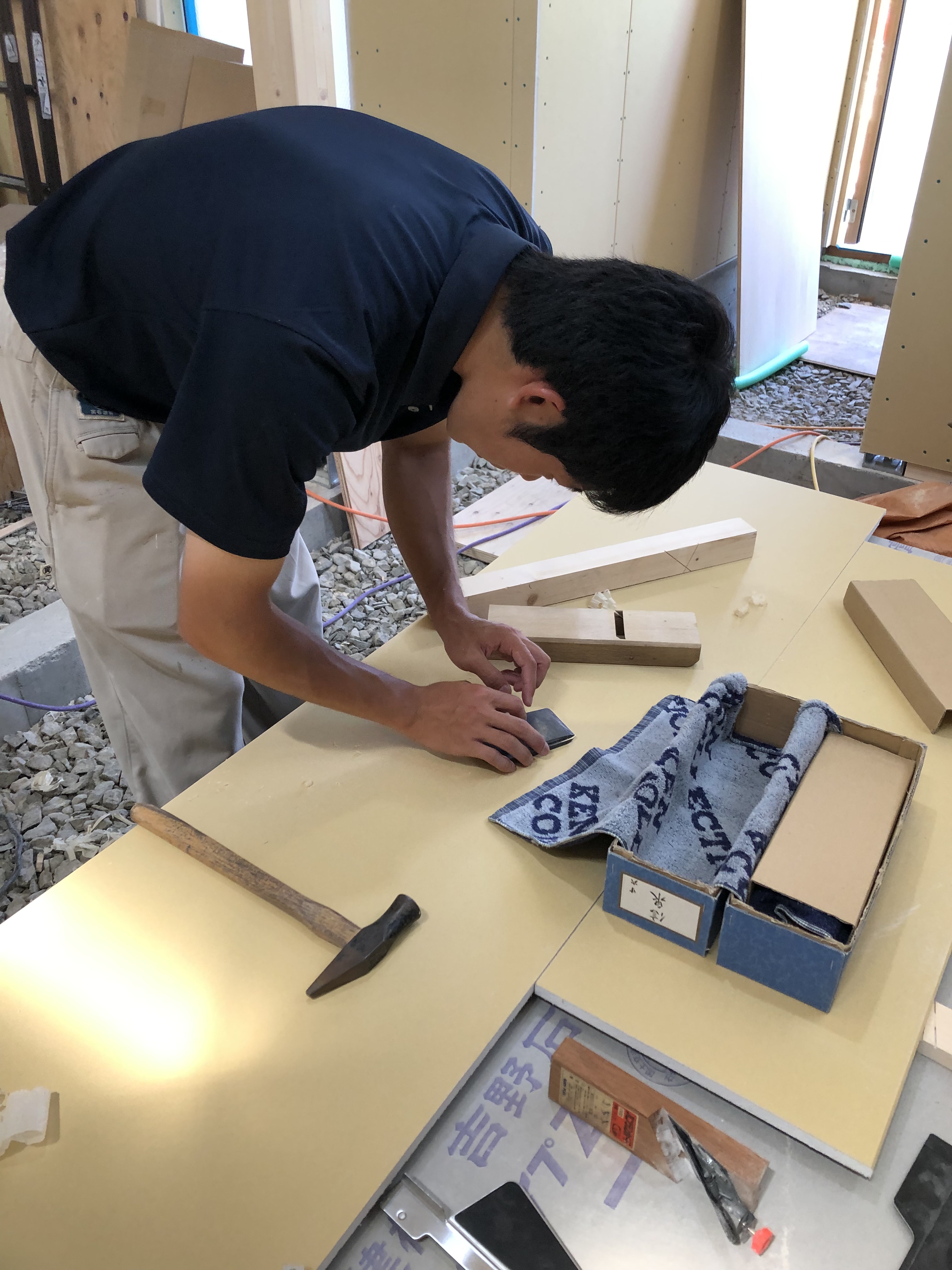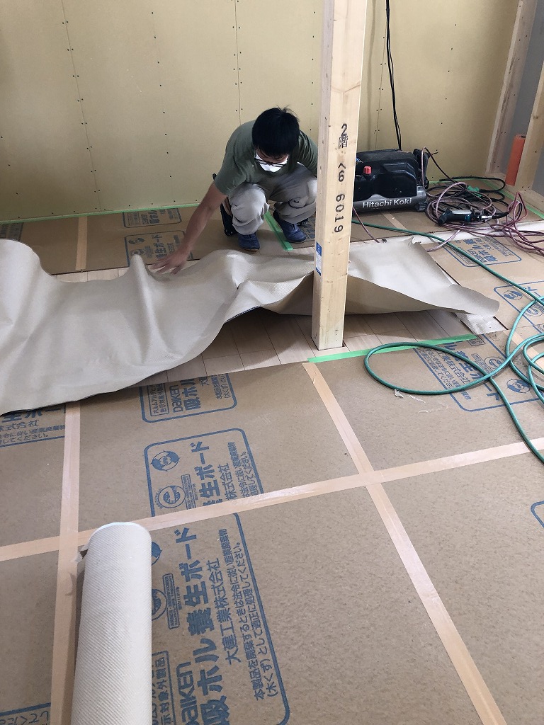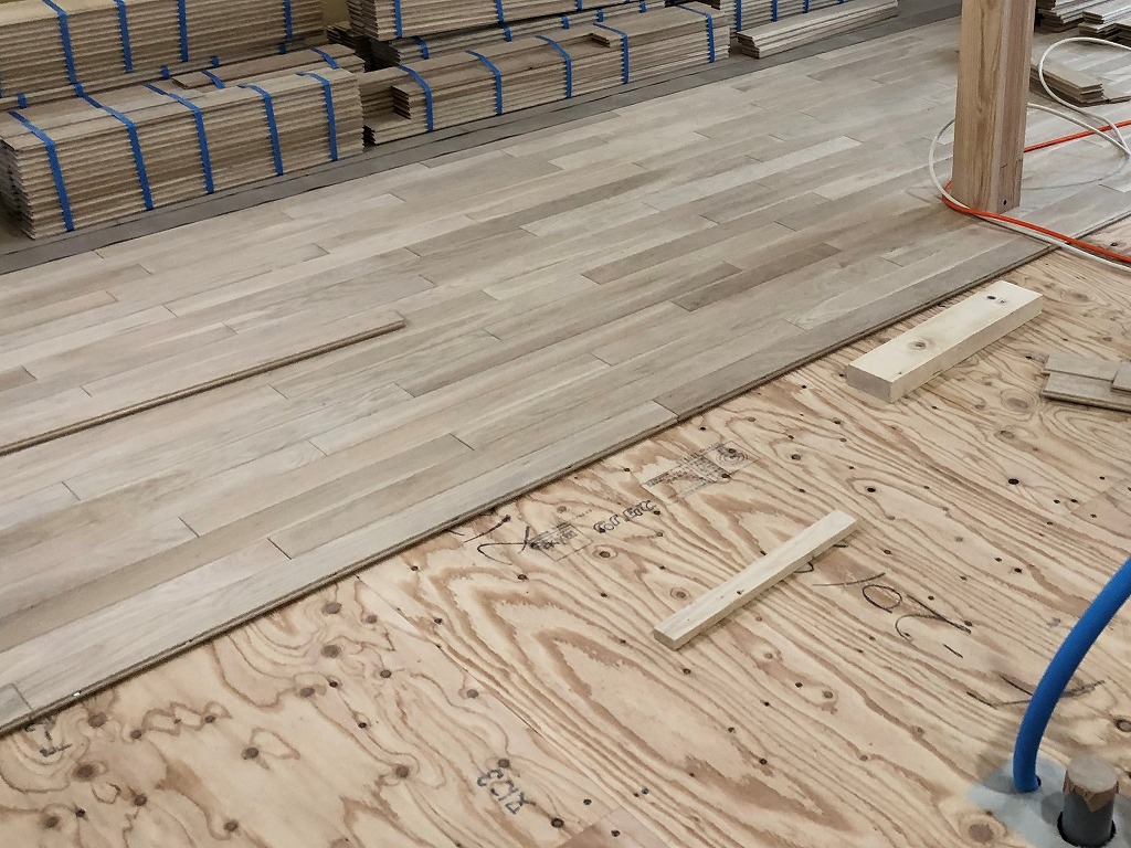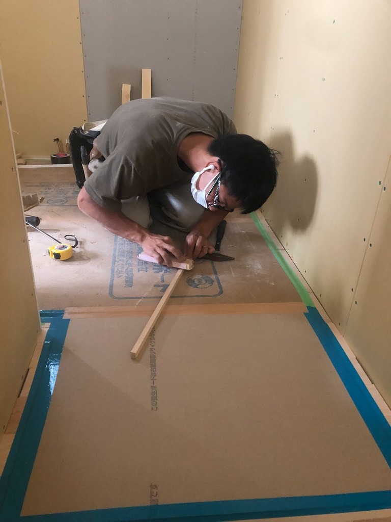 Tがし棟梁は黙々と無垢フローリングを張り続けています。これまでお伝えした通り無垢フローリングは