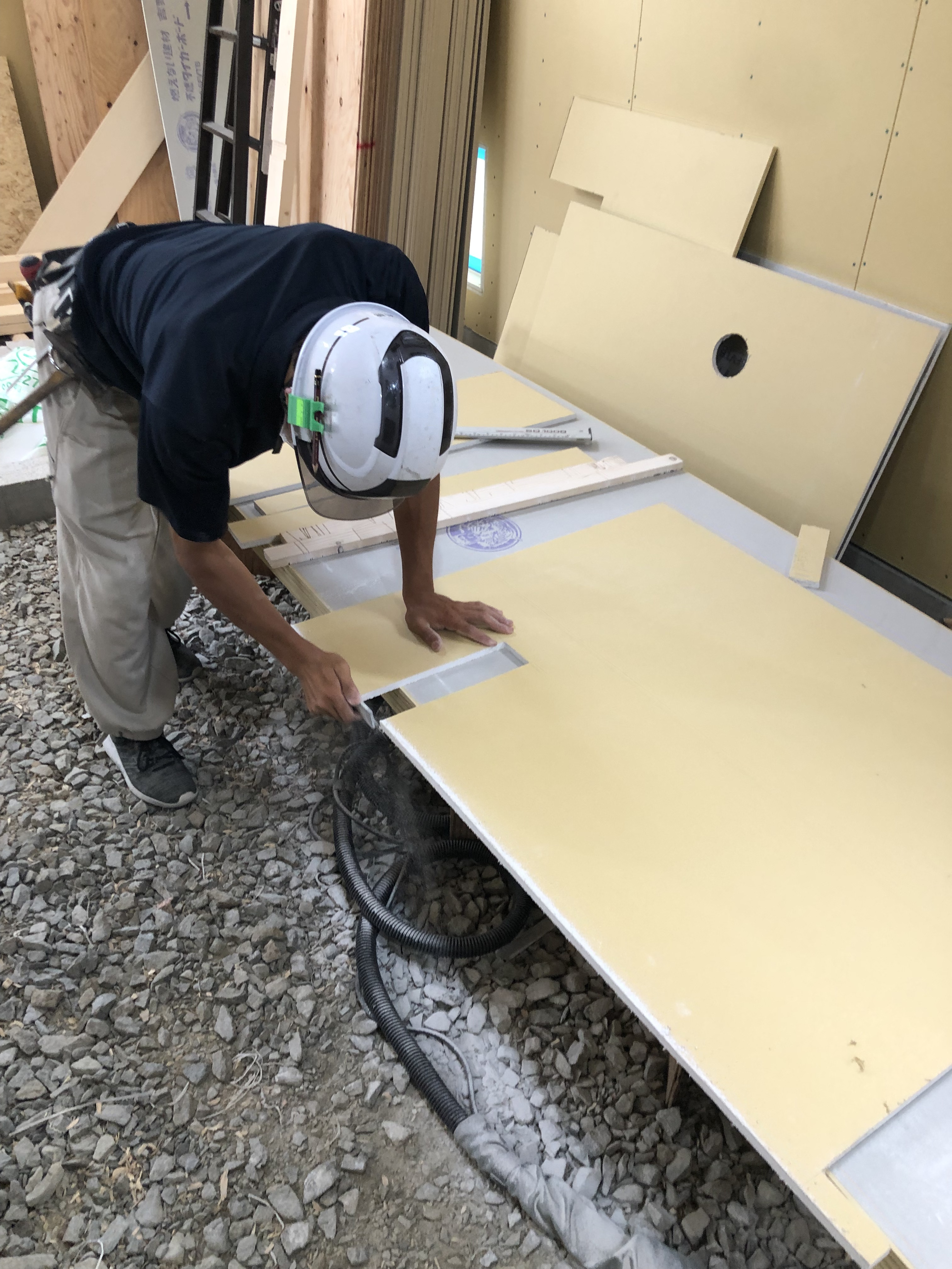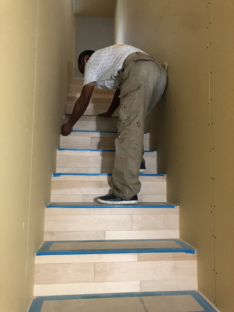 クロス工事前に下塗り塗装を行います。SUDOの階段は開放的な階段が多いので、
