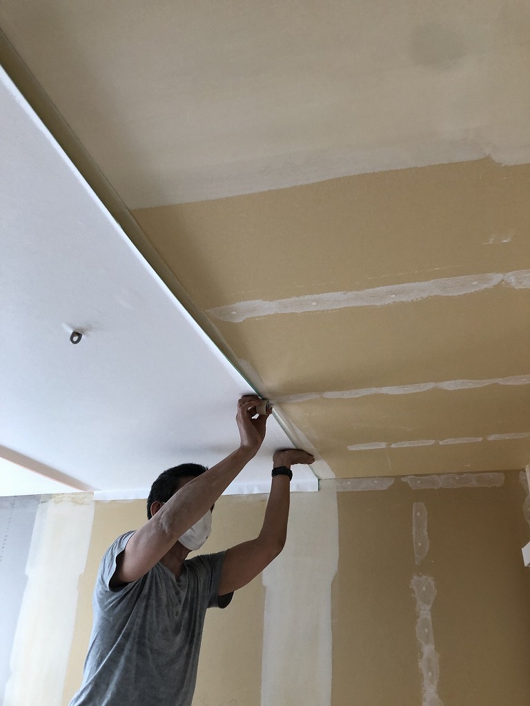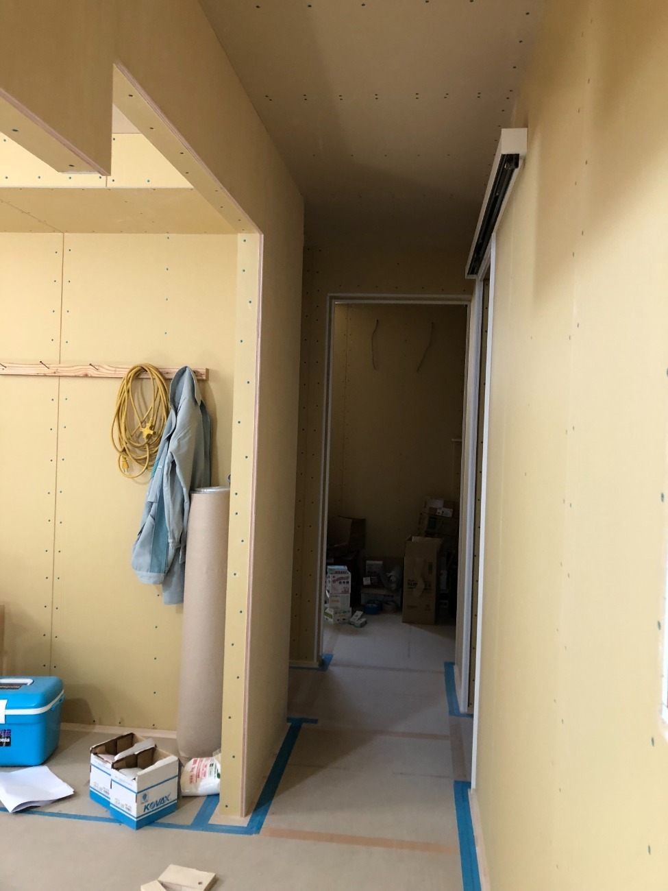 石膏ボードの継ぎ目をパテで埋めてからクロスを貼ります。