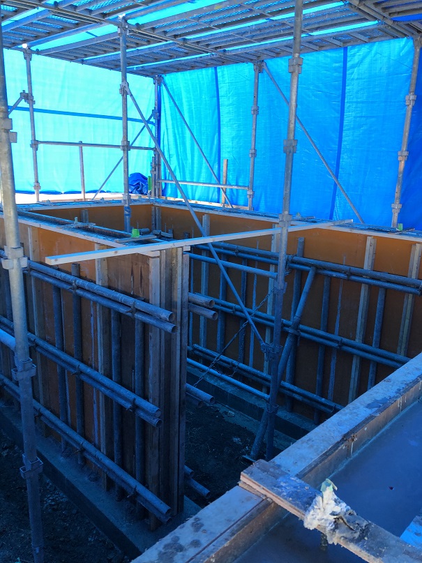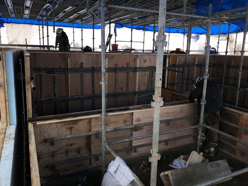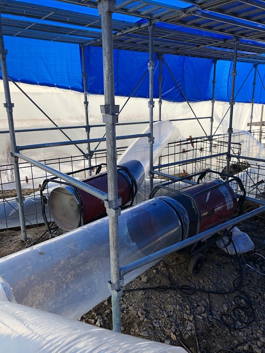コンクリートは寒さに弱いのでテントを架けて寒さ対策です。