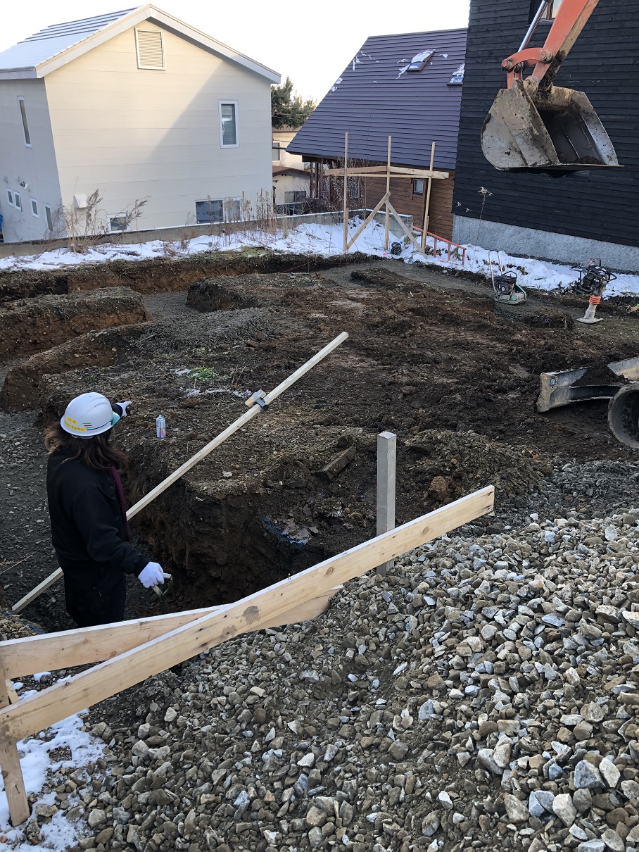 毎度お馴染み、基礎屋さんの梅ちゃんが掘りすぎないように高さを確認します。
