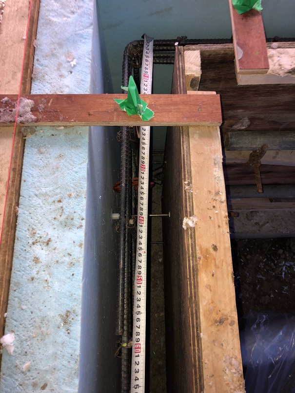 地面と平行に取り付けた木の上端が、できあがりの基礎の高さになります。