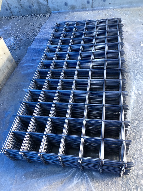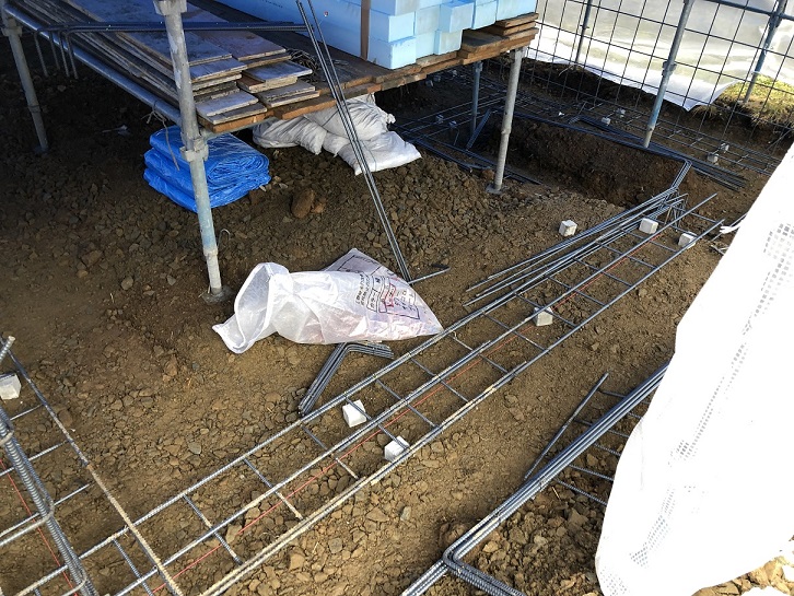 転圧された砕石の上に鉄筋を組んでいきます。コンクリート製のブロックを使ってしっかり砕石と鉄筋の被り厚さを確保しています。