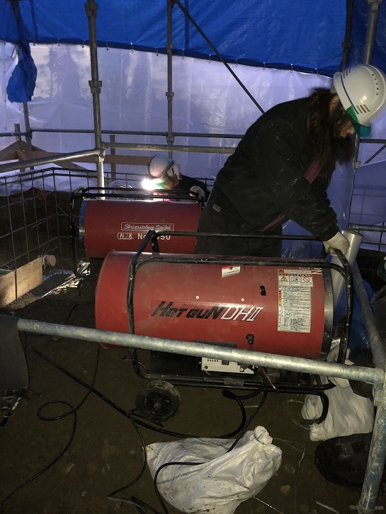 コンクリートが凍ってしまわないようにテントの中を暖めます。