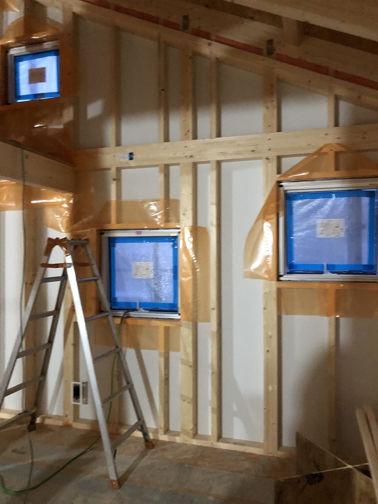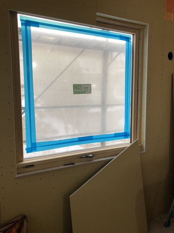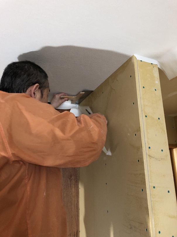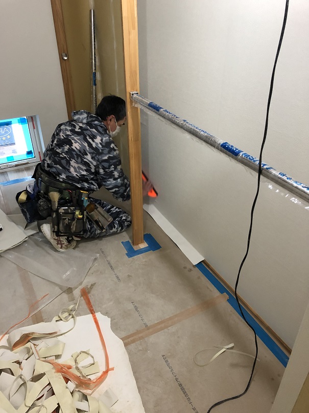 モルタルが壁に飛び散らないように、まずはあちこち養生していきます。