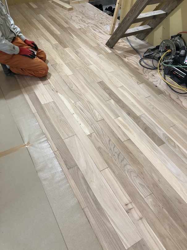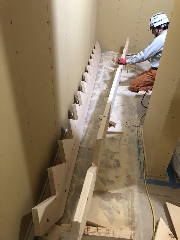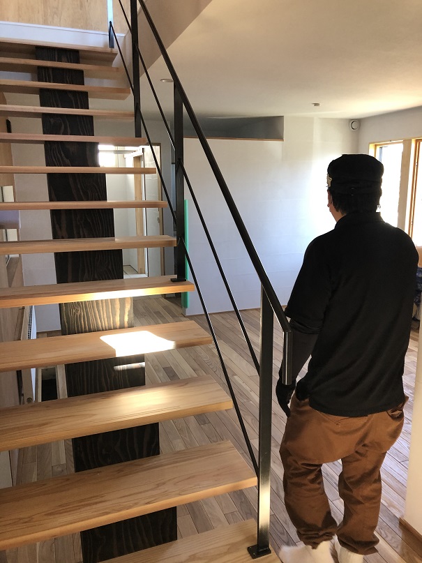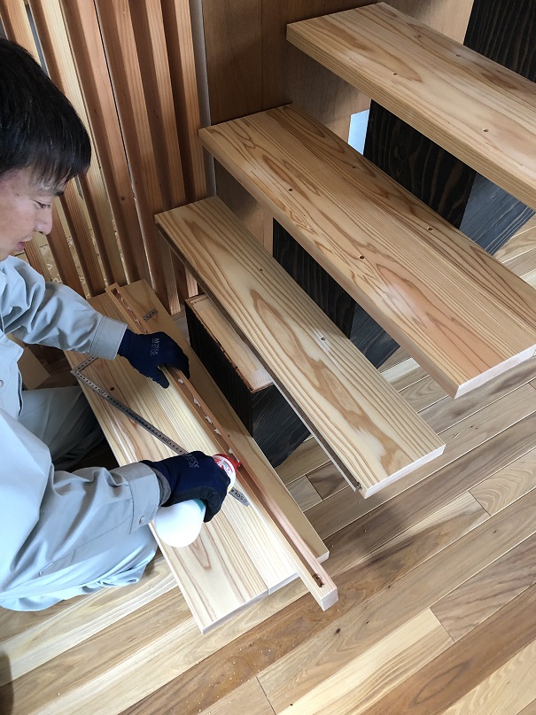 久しぶりに棟梁の登場です。無垢材の段板が届いたので取付に来てもらいました。