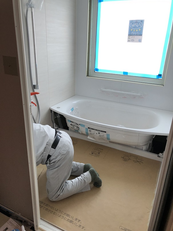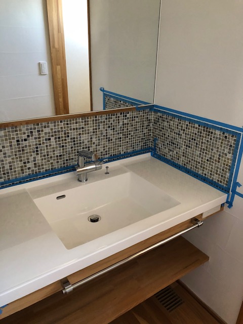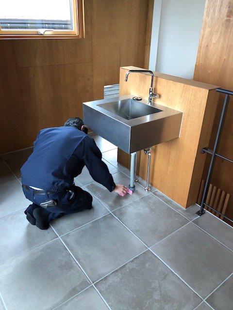 タイル廻りや設備機器廻りにコーキングを充填していきます。