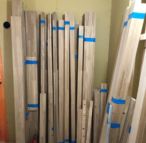 一枚板ではなく、あえて2枚の板をくっつけることにしました。それも何種類かの板幅を用意して、1段1段ジョイントの位置を変えるという遊び心です。