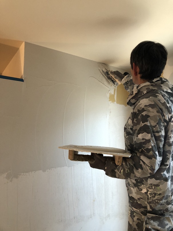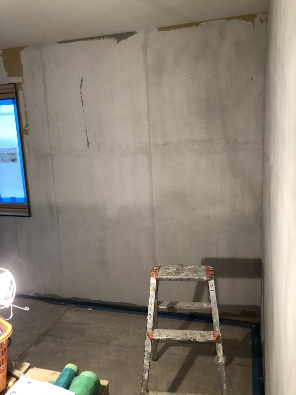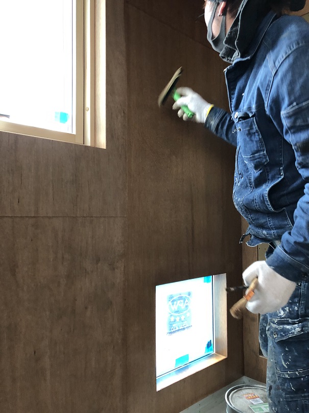 塗壁の下塗りが乾燥したところで仕上げ塗りです。