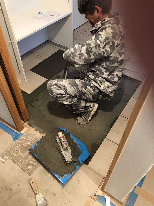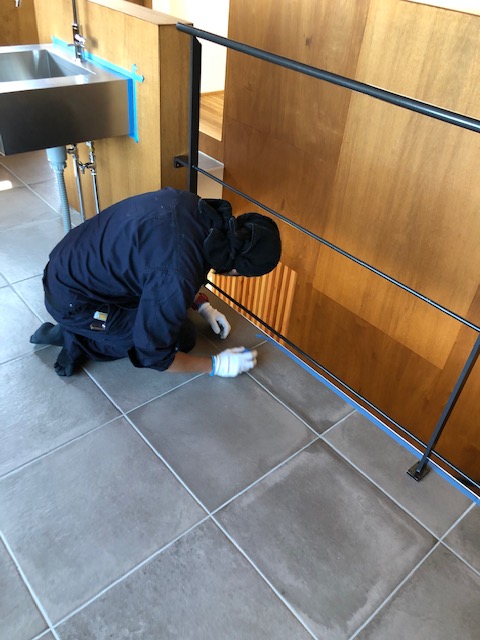 モルタルを敷き詰めた後はタイル屋さんが割り付けに合わせて貼っていきます。