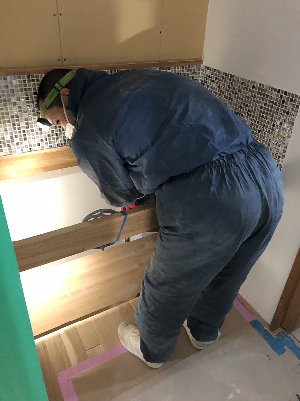 このタイミングでフローリングの上を靴下で歩くと、美装屋さんから語気強めにこう言われます。「靴下だとあちこち汚れ引っ張るから、スリッパ履いて下さい。」