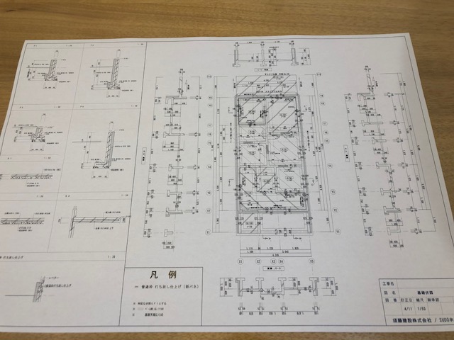 「展望」の家は基礎が見えるところもあって、そういったときはより細部を検討することになります。こうして検討した部分を現場の職人さんに分かりやすく伝えるためにも施工図を描いてます。