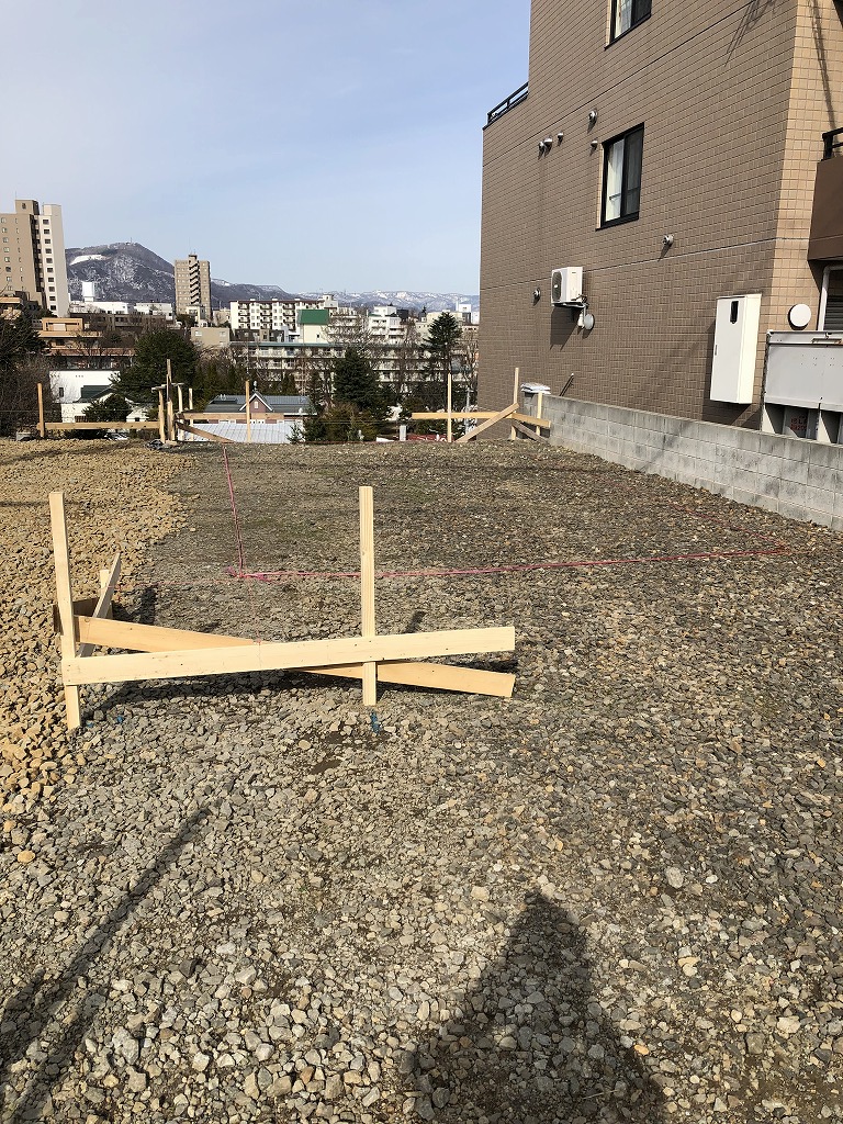 敷地内の四隅にこんなのがあると、これから基礎工事が始まるんだな、の合図です。