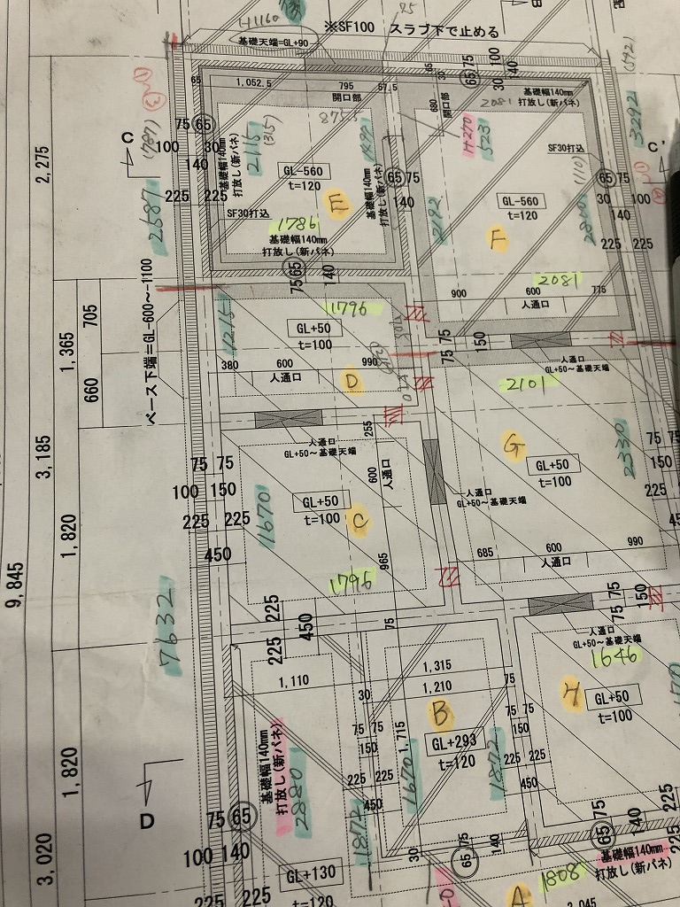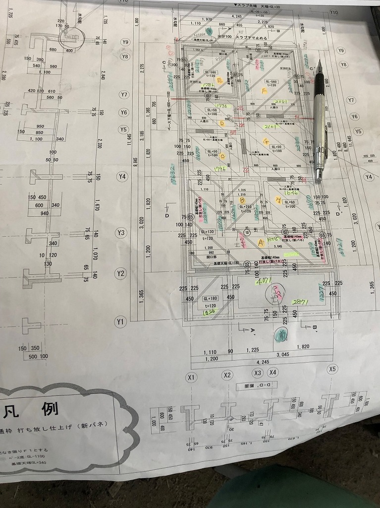 ゴチャゴチャして見づらいかもしれませんが基礎の施工図です。設計担当のYさんと細かな納まりを協議しながら作図します。