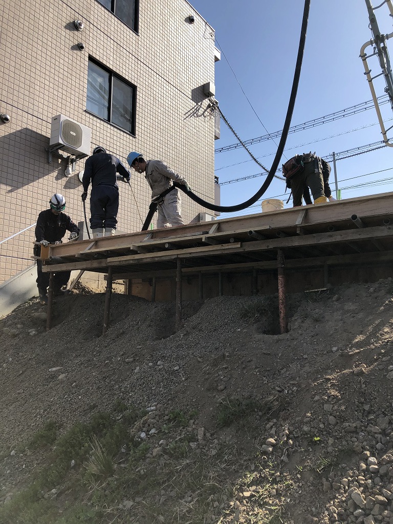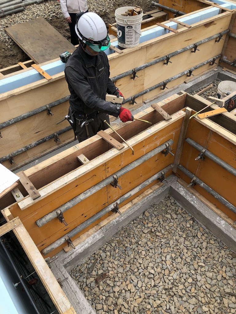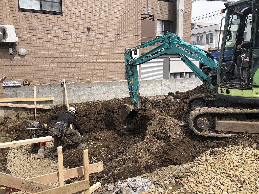 もう少し幅を広げて掘って、色んな指示を出しています。「重機で土を掘るオペレーターさん」と「掘る深さとかを指示する職人さん」