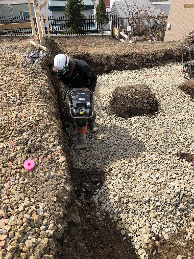 っと思いきや、今度はランマーで砕石を締め固めています。