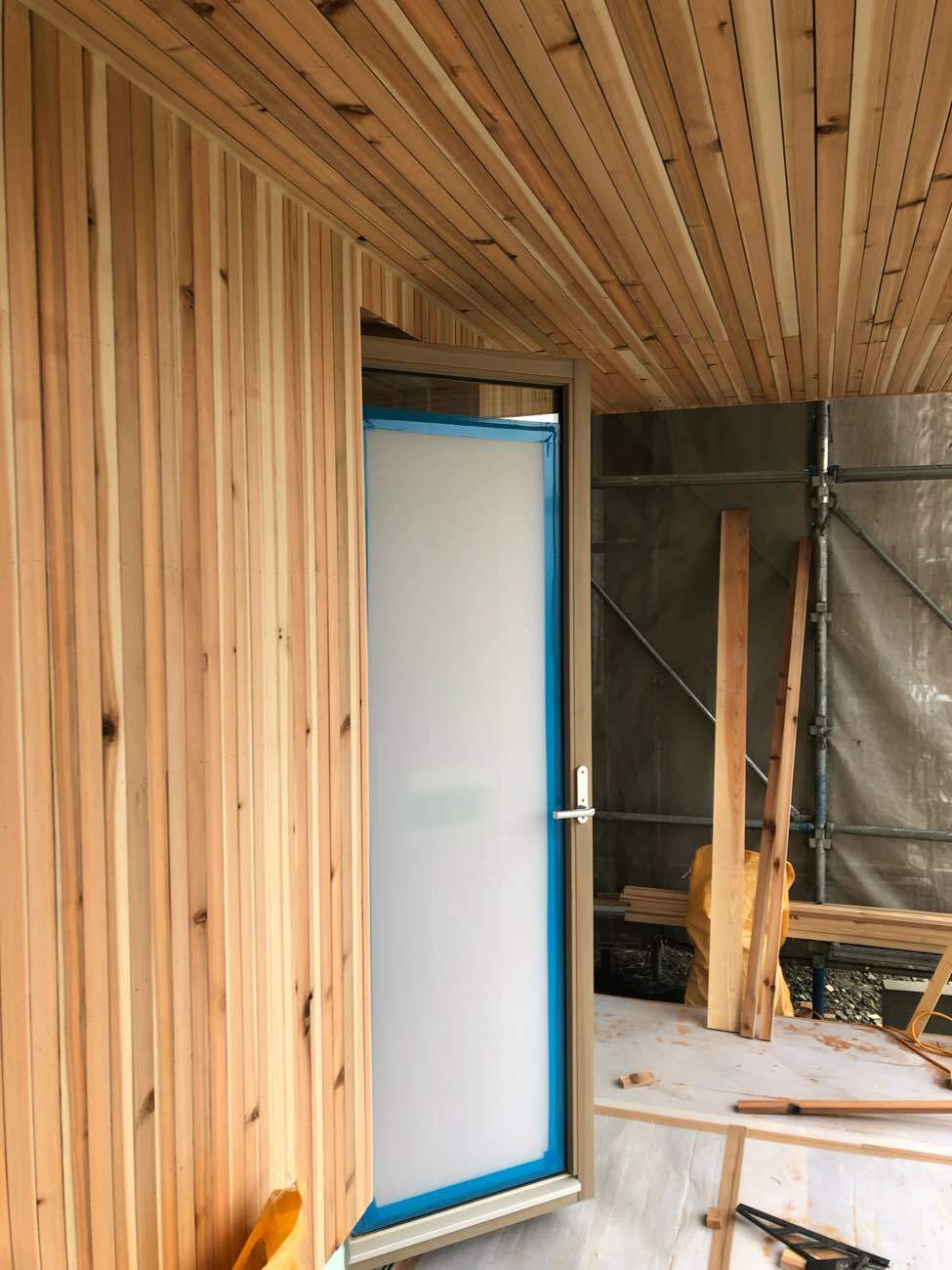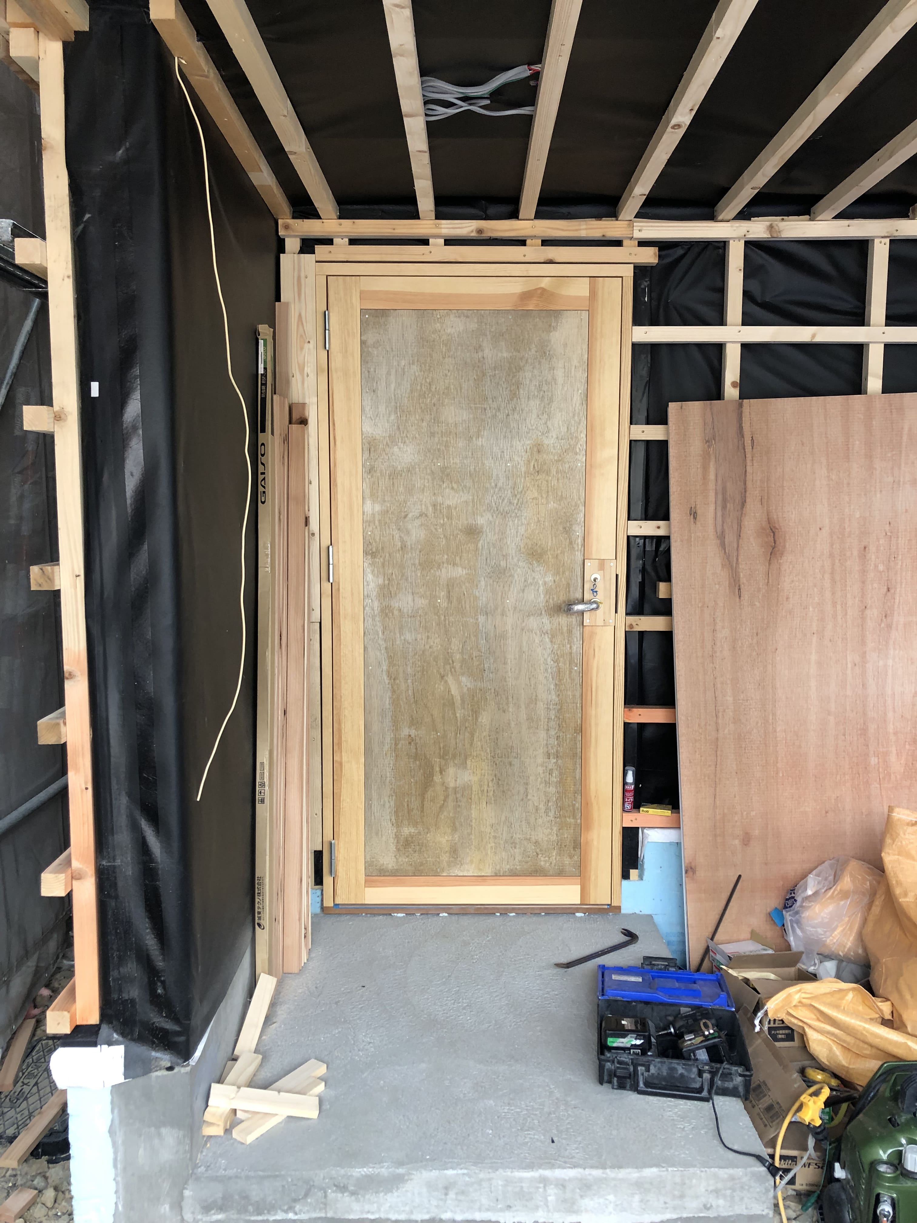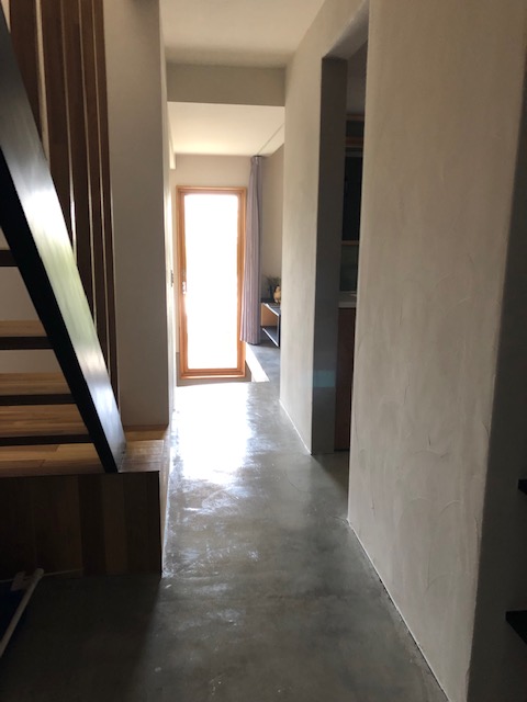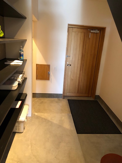 木製断熱玄関ドア・製作断熱郵便戸はいつも通りSUDO標準仕様です。無垢フローリングでなければタイルでもない、「展望」はモルタル床になっています。