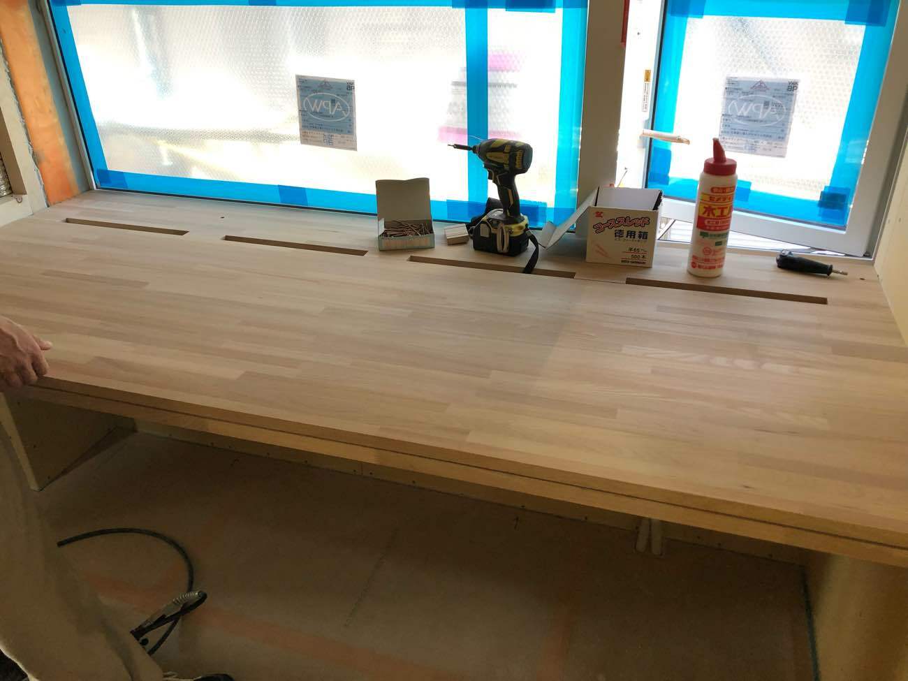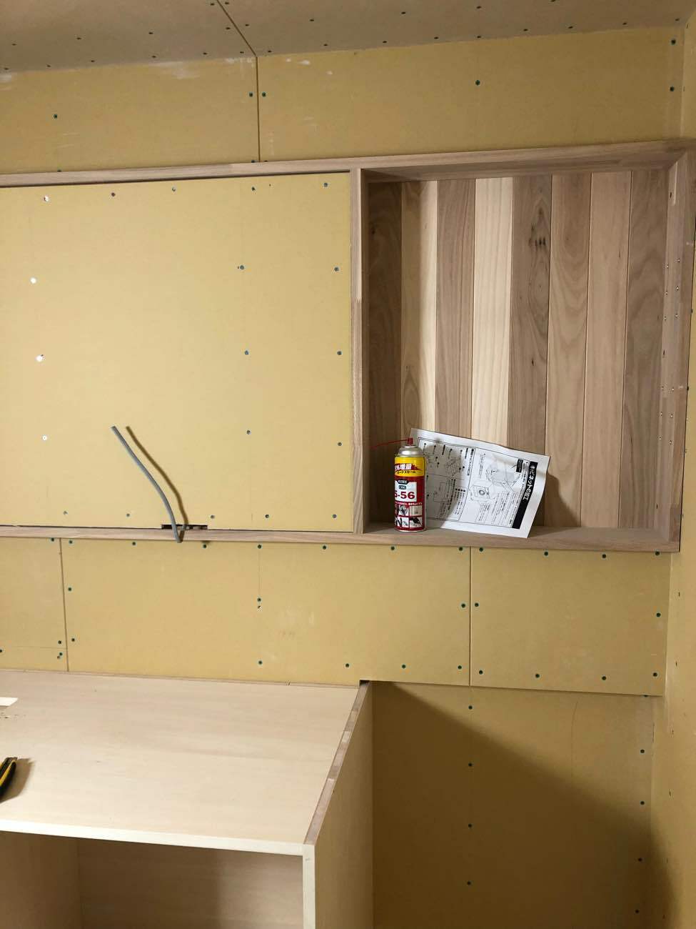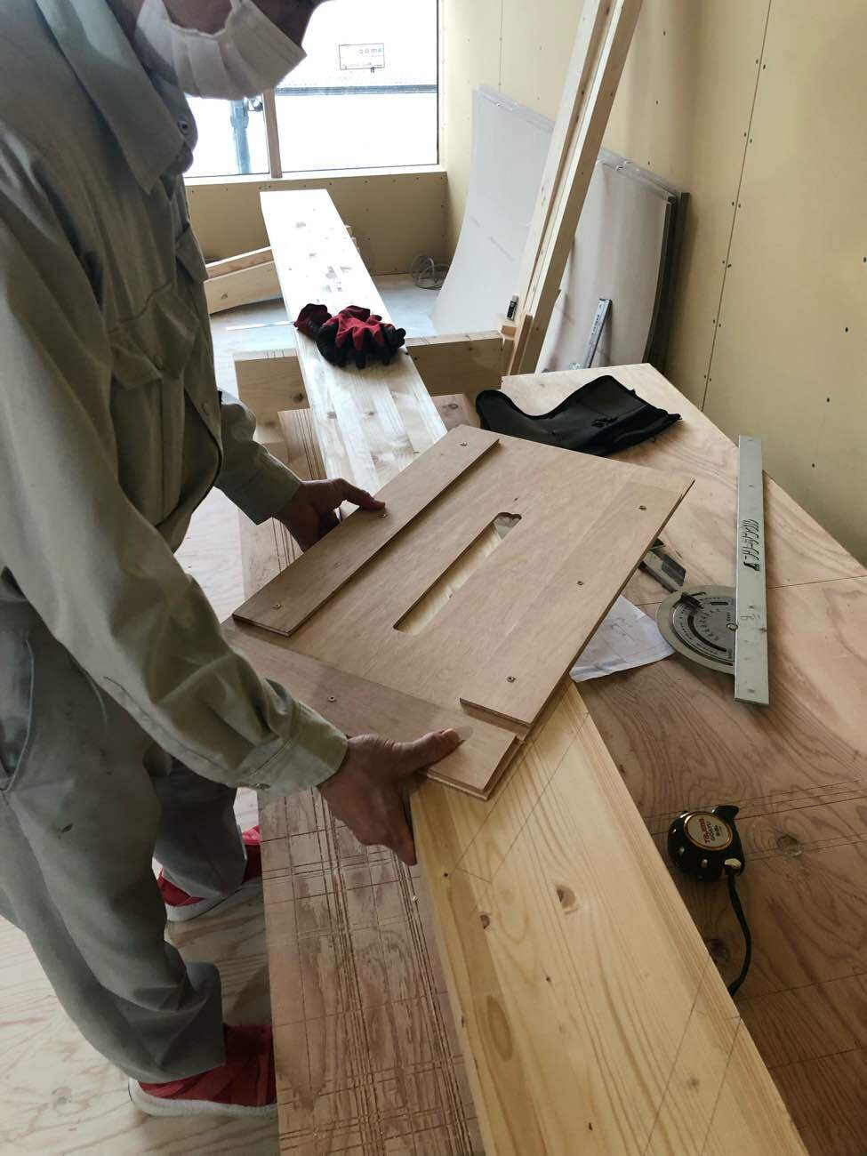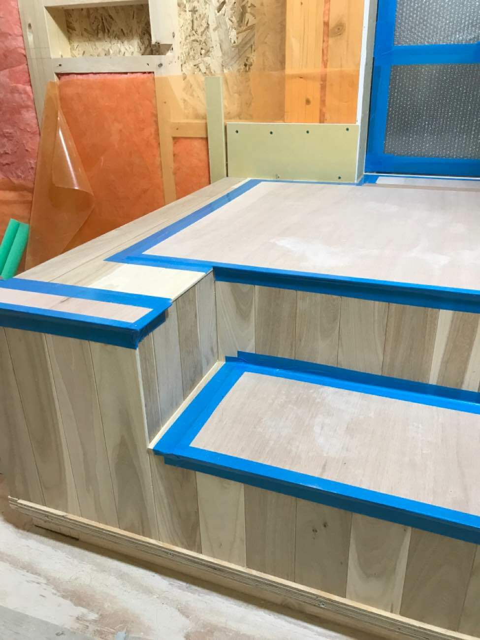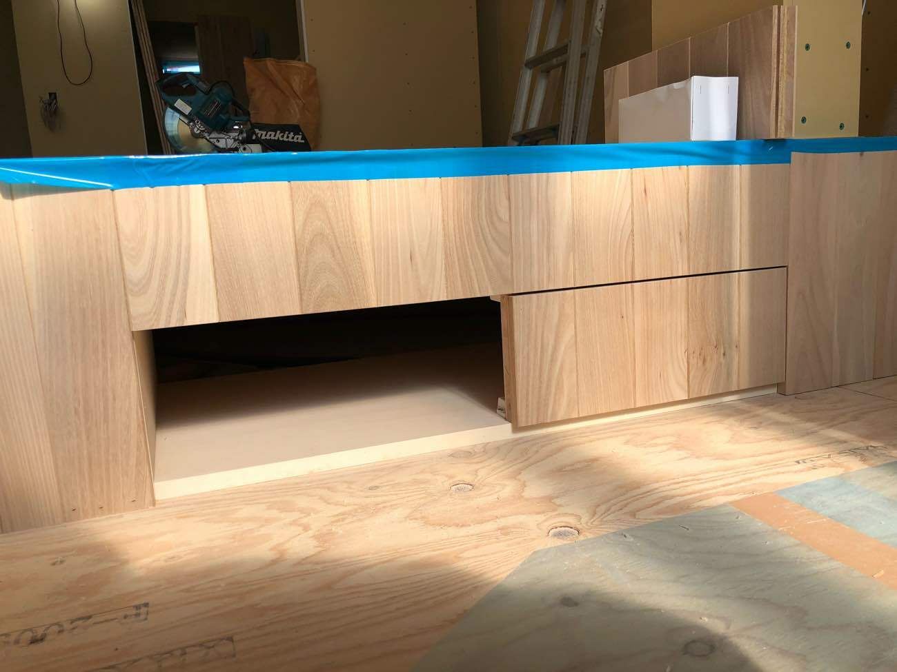 (もしかしたら養生してるようにしか見えてないかもですが。)実は左官で仕上げる天板で、現場仕上げになるのでこんな感じになっています。