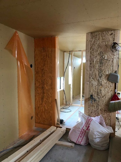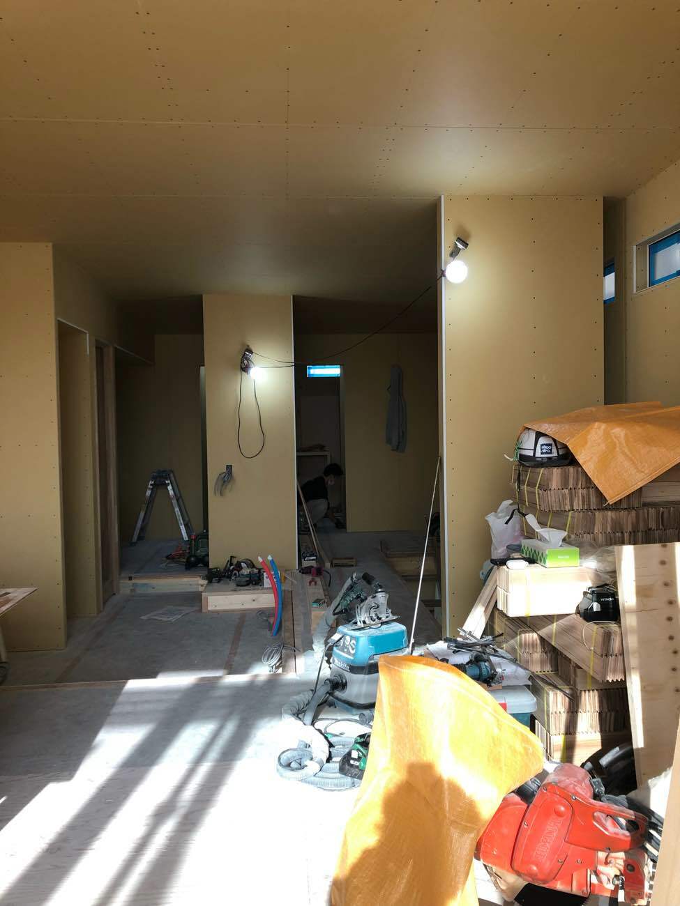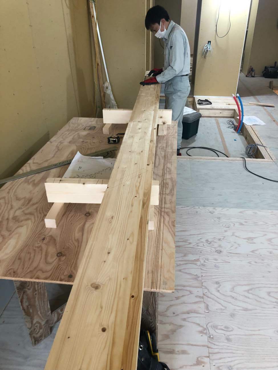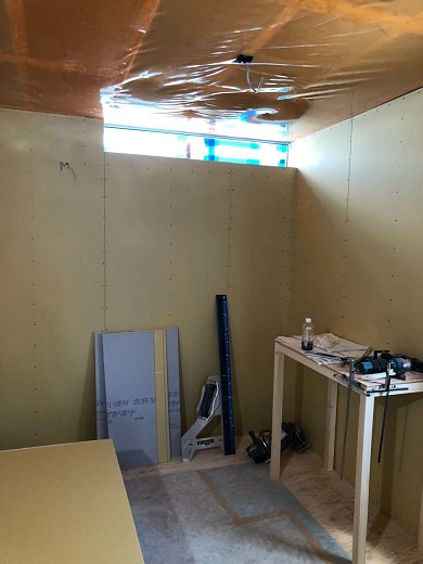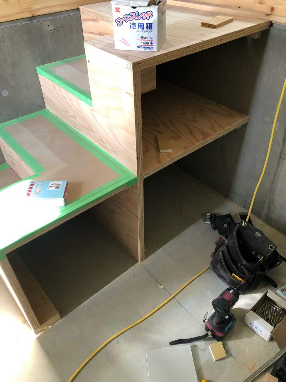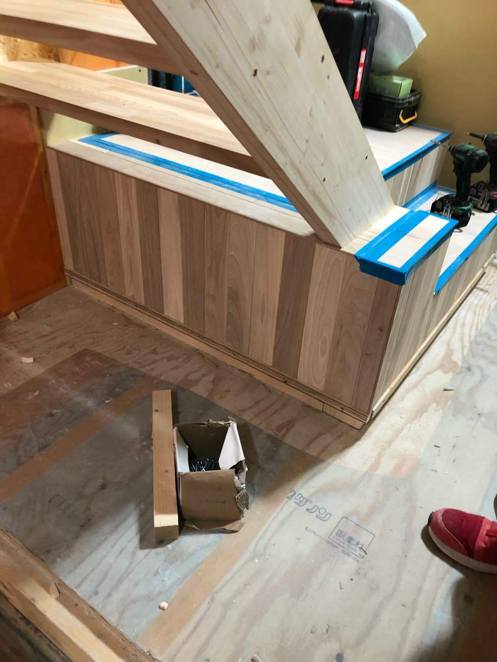 (もしかしたら養生してるようにしか見えてないかもですが。)実は左官で仕上げる天板で、現場仕上げになるのでこんな感じになっています。