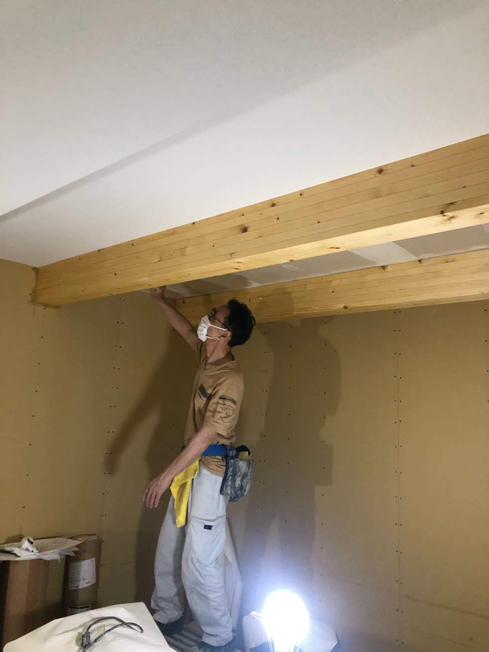 クロスを張っていきます。天井が白くなるだけでも雰囲気がガラっと変わりました!