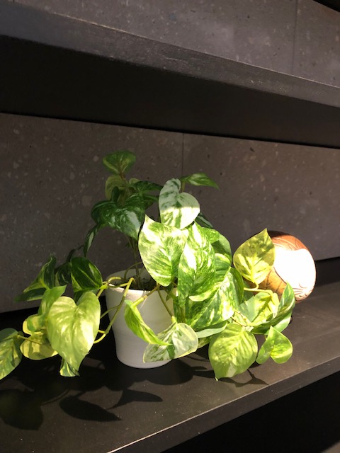 玄関入ってすぐの棚。白い壁に黒い棚、背面には札幌軟石を貼ってアクセント。