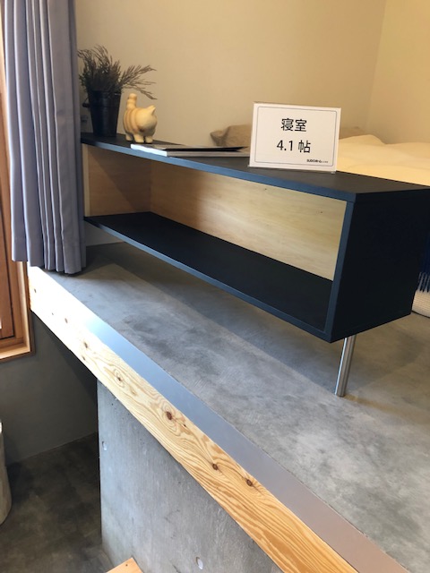 寝室のベッドサイドには宙に浮いた造作収納があります。