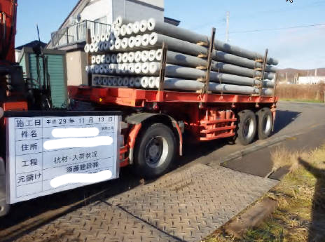 電柱のような形の鉄筋コンクリート製の杭を積んで杭屋さんが登場しました。