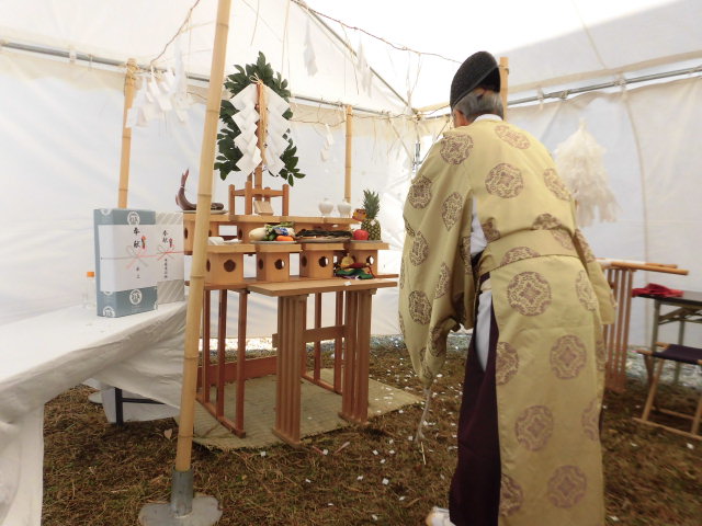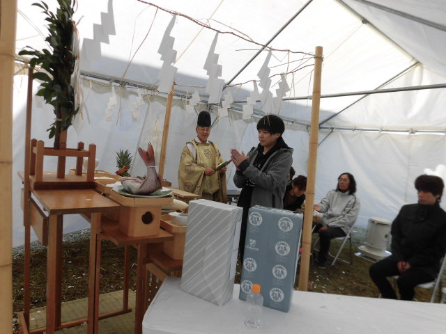 天候に関係なく地鎮祭が執り行えるようにいつもテントを張っているのですが、この日は風がかなり強く、テントが飛ばされないかちょっとヒヤヒヤしました(汗)