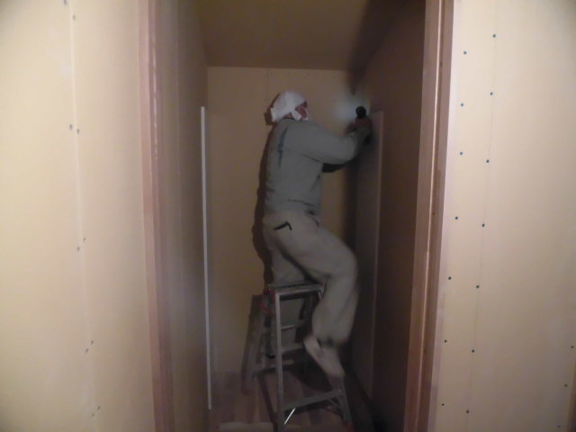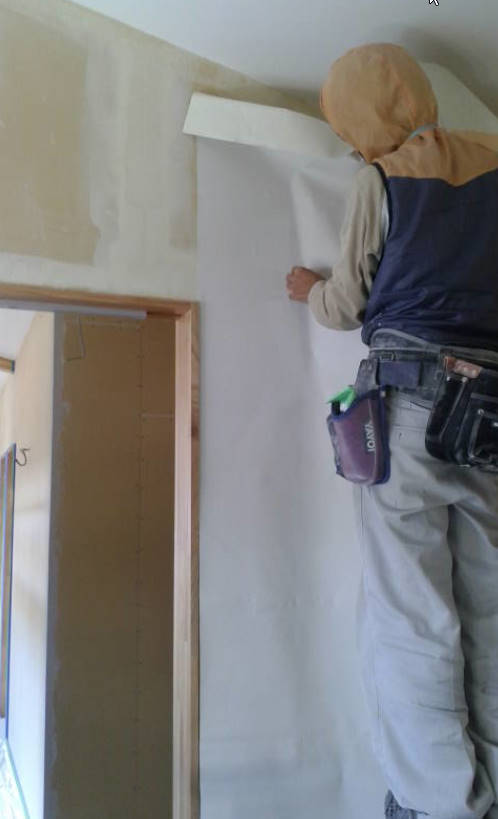 石膏ボードの継目を埋めてからクロスを貼っていきます。おなじみの珪藻土クロスです。
