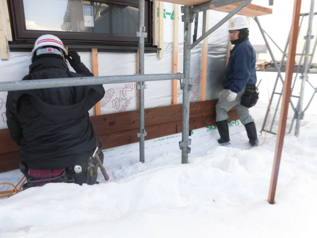 屋外工事中の大工さんは外装の杉板を張っています。
