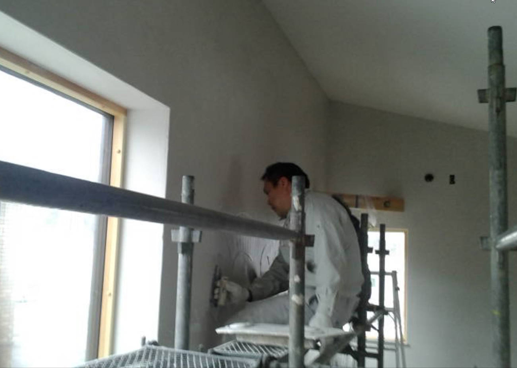 石膏ボードの継目やビス頭を埋める為に、壁全体を珪藻土で下塗りします。