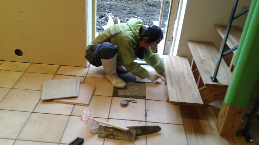 床のタイルを貼っています。