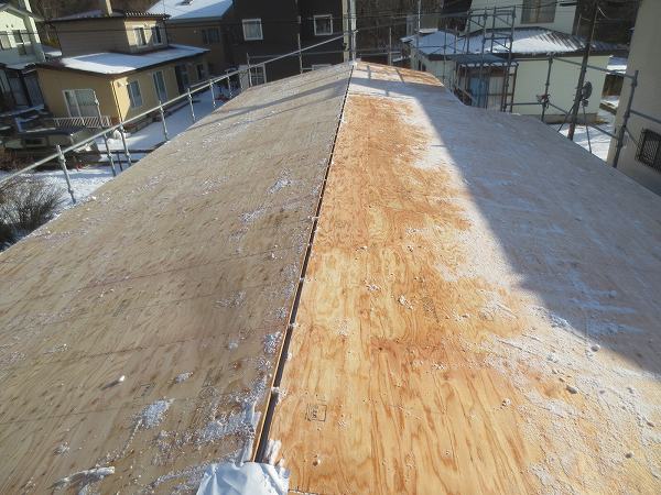 屋根の合板が張り終わりました。てっぺん部分が空いてますね。