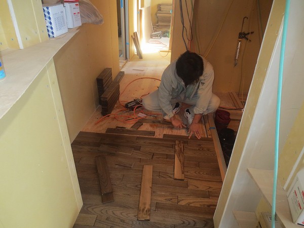 T弥君がフローリングを1枚づつ張っていきます。