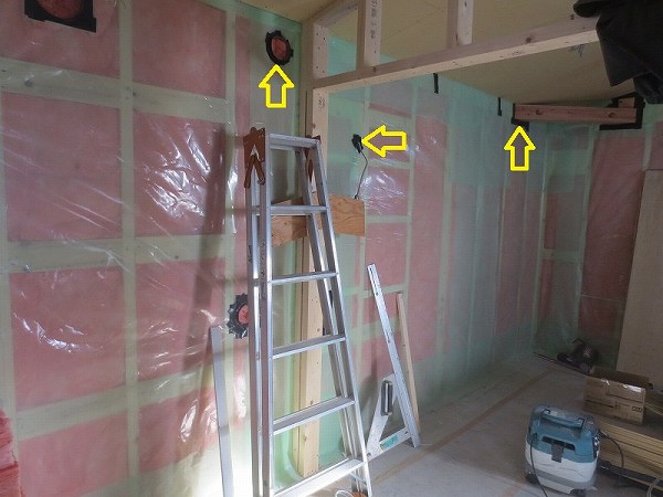 黄色矢印がコンセントを取り付けるためのボックス