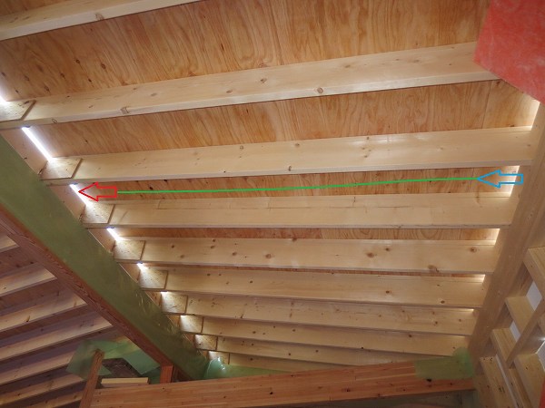 どんなに断熱しても部屋の熱は外に少しずつ漏れますので、漏れた熱が直接屋根に接しないように青矢印側(軒先)から赤矢印側へ