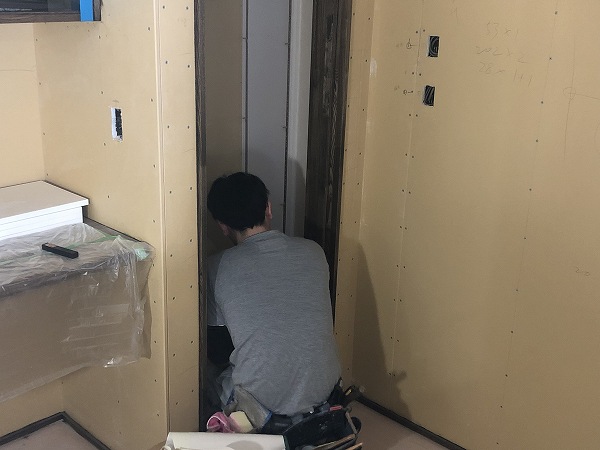 ここはユーティリティーなので、壁・天井共に水に強い素材を貼っていきます。