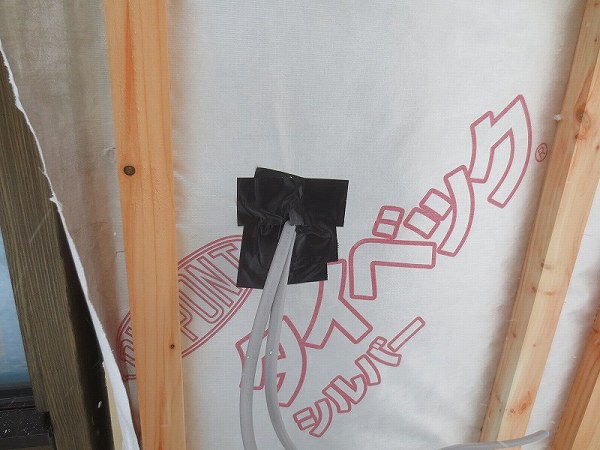 気密シートを貫通する部分(換気口や電気の線)は気密テープでしっかり補強します。
