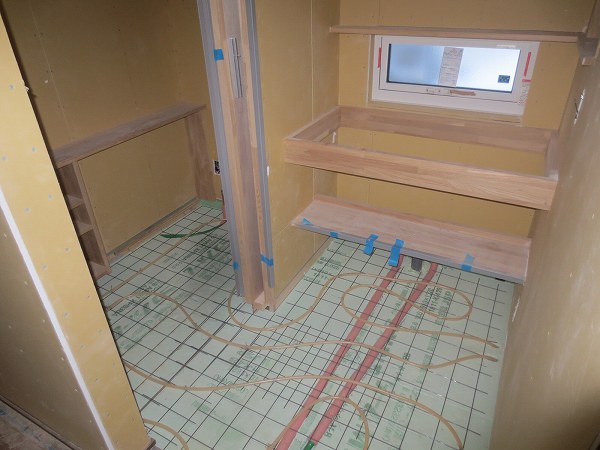 洗面所とトイレの床はタイル張りとなるので床暖房の配管をしています。